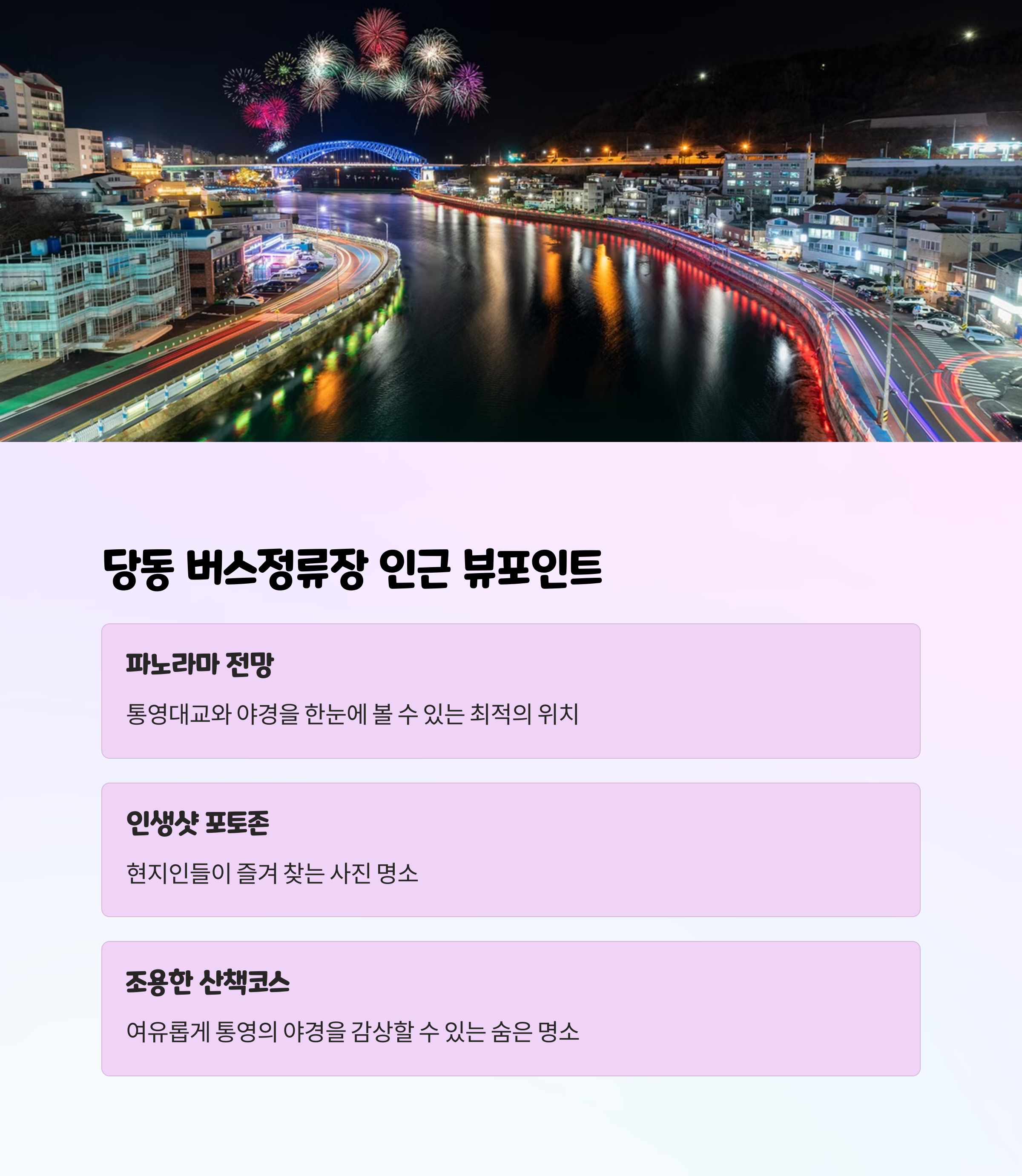 통영대교 외에도 감성적인 야경 장소가 있다면 댓글로 추천해주세요! 또 다른 통영의 밤을 함께 발견해봅시다.