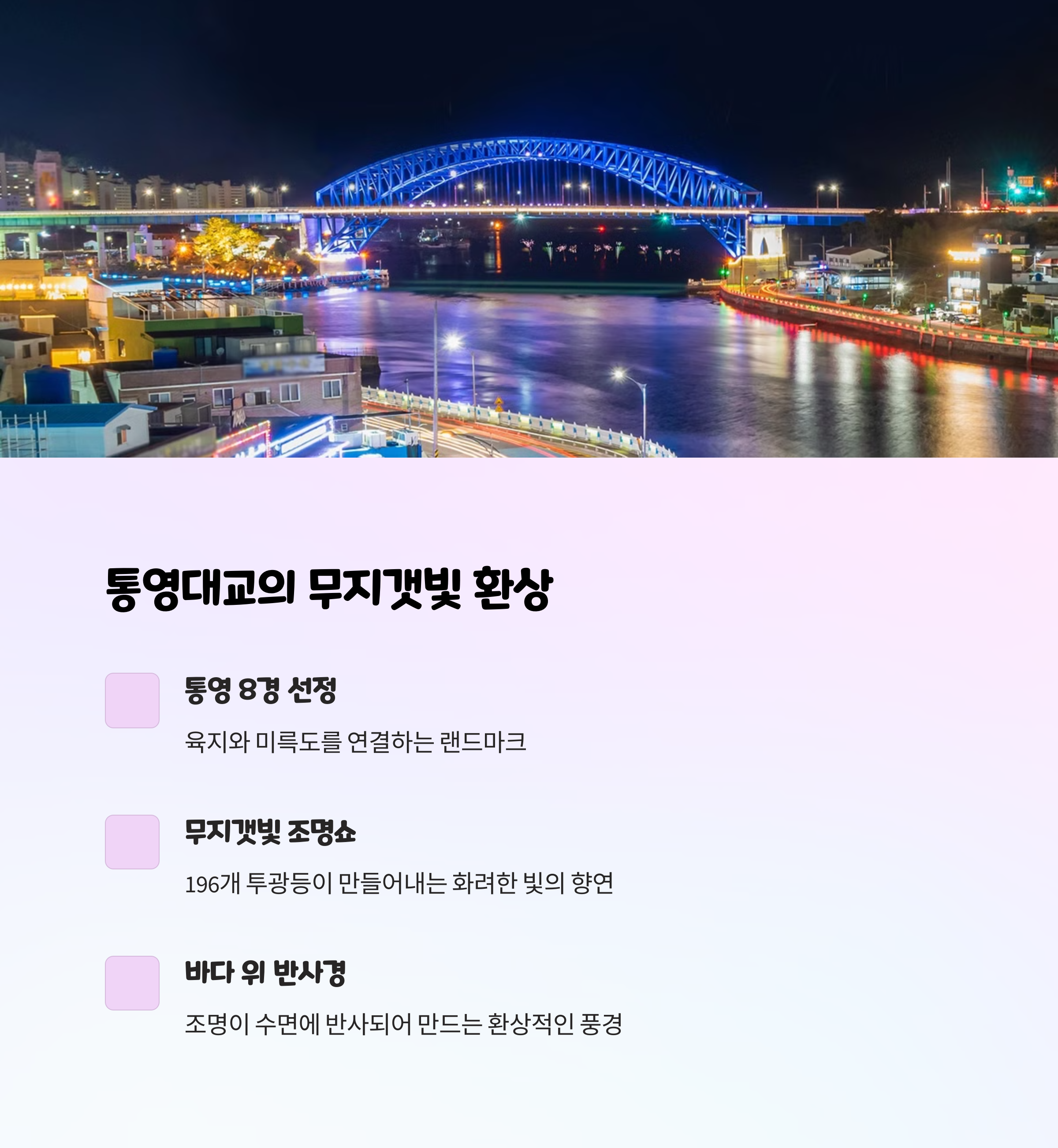 통영대교는 육지와 미륵도를 연결하는 주요 교량이자 밤이면 무지갯빛 조명과 수면 반사로 유명한 통영의 대표 야경 명소입니다. 다리 위와 주변 산책로에서는 반짝이는 조명과 바다 풍경이 어우러져 산책·사진·감상을 위한 최고의 장소로 손꼽힙니다. 특히 해 질 무렵부터 빛이 켜지는 순간은 꼭 놓치지 말아야 할 포인트입니다.