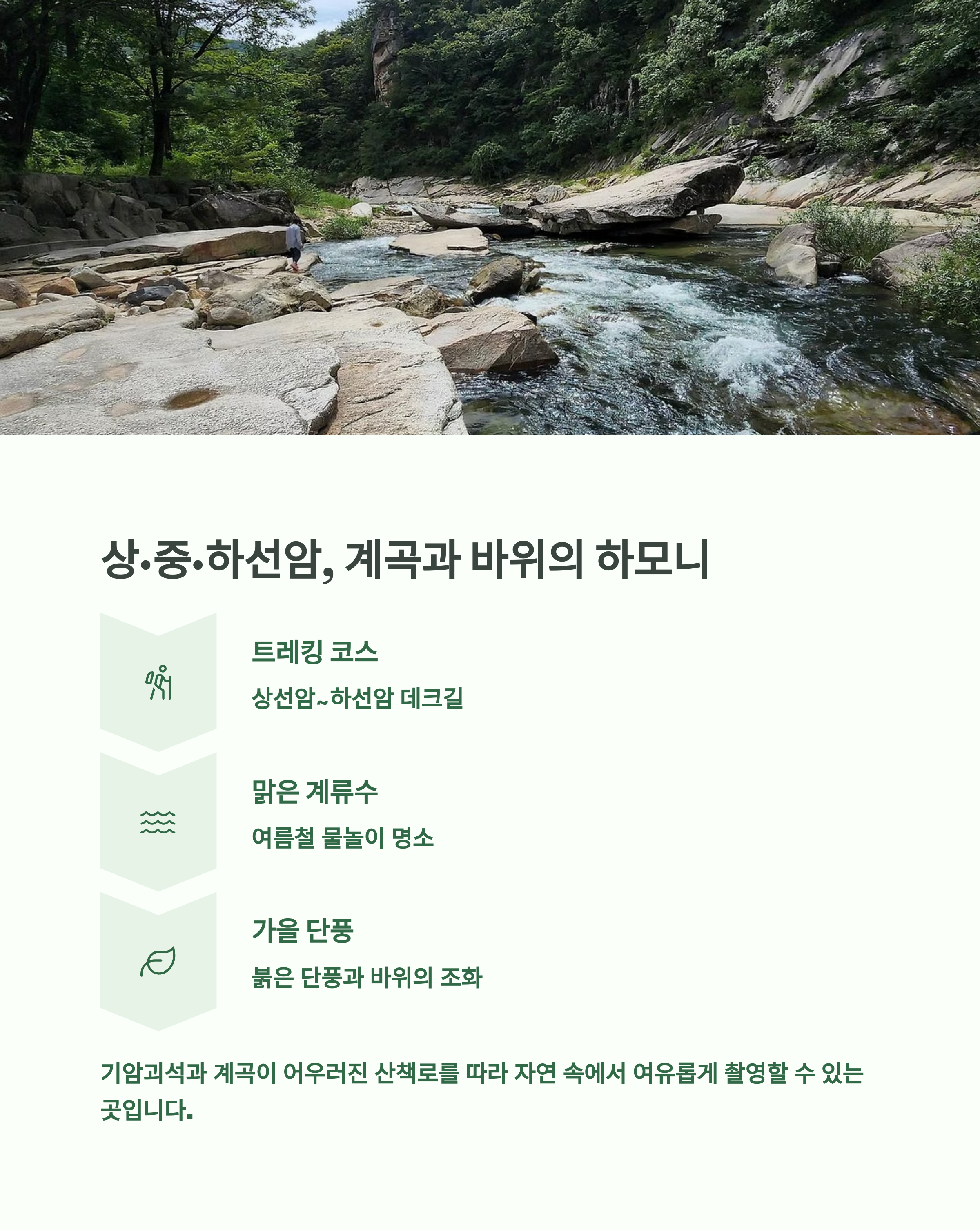 상선암, 중선암, 하선암 구간은 기암괴석과 계곡이 어우러진 산책형 코스로, 데크길과 작은 폭포, 시냇물이 이어지는 풍경 감상 코스입니다. 또한 만천하스카이워크나 패러글라이딩 활공장에서는 단양의 물돌이 지형과 팔경 전경을 한눈에 내려다볼 수 있어 드론 없이도 압도적인 뷰를 찍을 수 있어요.