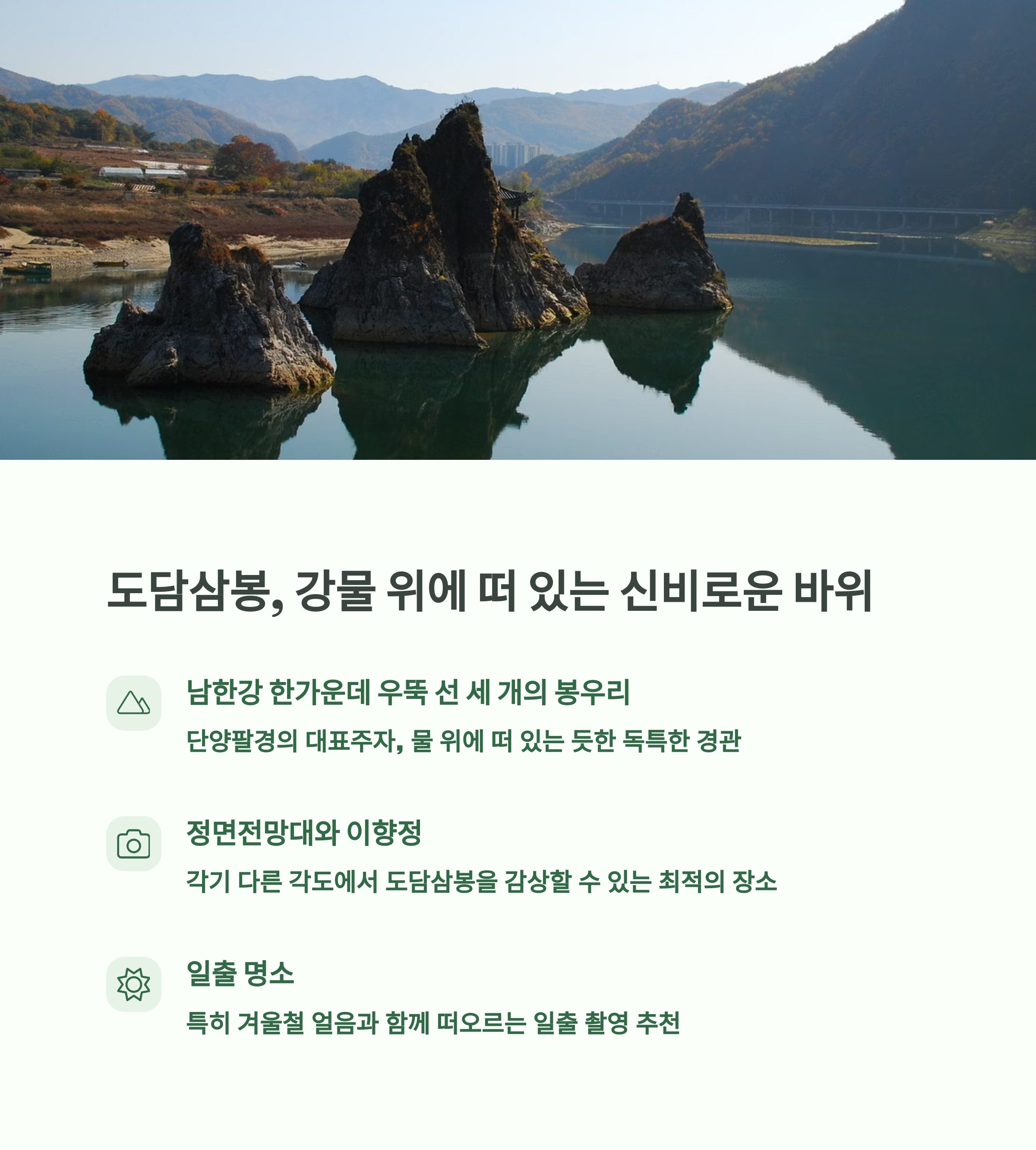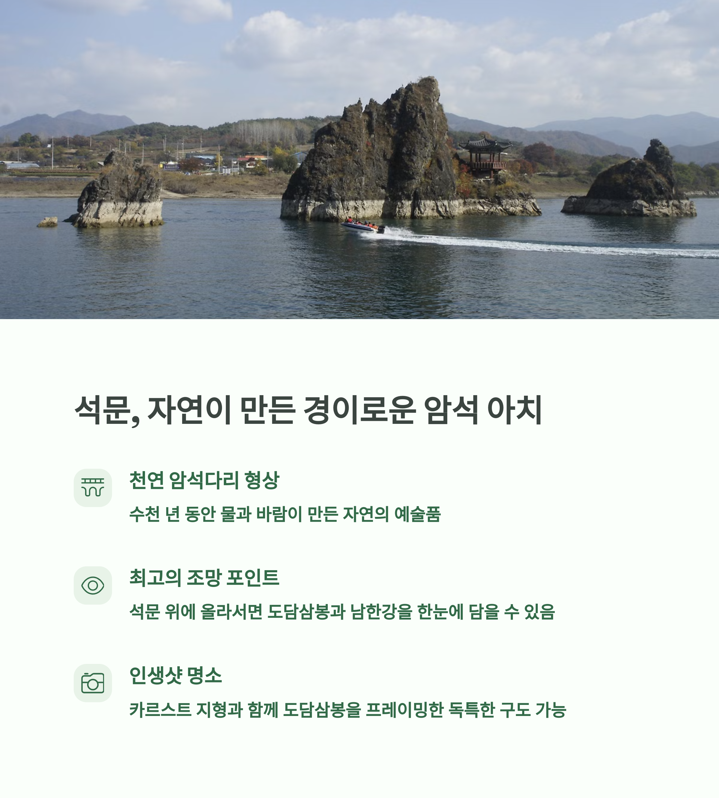 단양팔경은 자연이 만들어낸 절경의 연속이자 사진 찍기 좋은 여행지로 사계절 내내 사랑받는 명소입니다. 강, 바위, 숲, 일몰까지 모든 뷰포인트가 다채로운 매력을 갖추고 있어 단양 여행의 감성을 더해줄 멋진 인생샷을 남길 수 있어요.