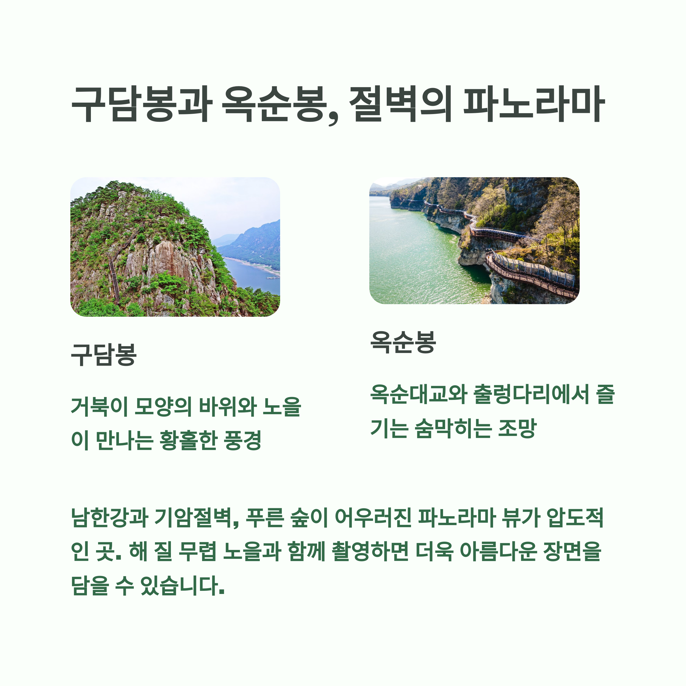 구담봉과 옥순봉은 깎아지른 절벽과 남한강 풍경이 어우러진 파노라마 뷰가 매력적인 곳이에요. 트레킹을 통해 봉우리 정상에 오르면 절벽 아래 흐르는 강과 푸른 숲이 한눈에 펼쳐지며, 특히 노을이 질 무렵 촬영하면 더욱 아름답고 몽환적인 분위기가 연출됩니다. 가을 단풍철과 봄철 연두빛 숲도 놓칠 수 없는 포인트입니다.