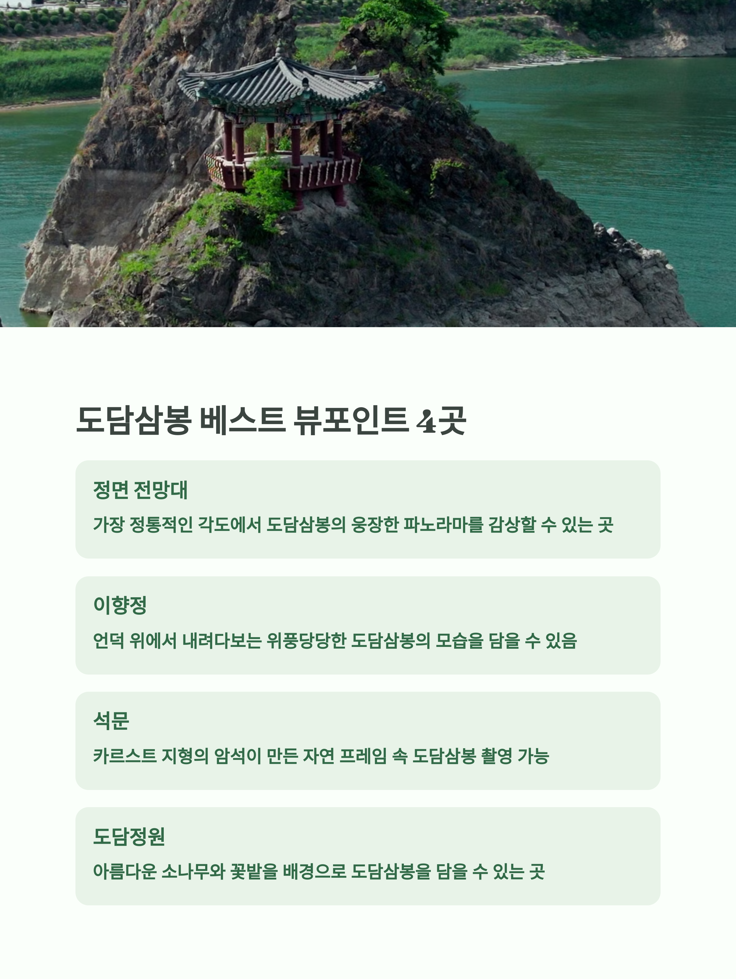 | 추천 포인트 | 도담삼봉 석문 전망대, 구담봉·옥순봉 일몰 뷰, 상선암 데크길, 만천하스카이워크, 패러글라이딩 뷰 |