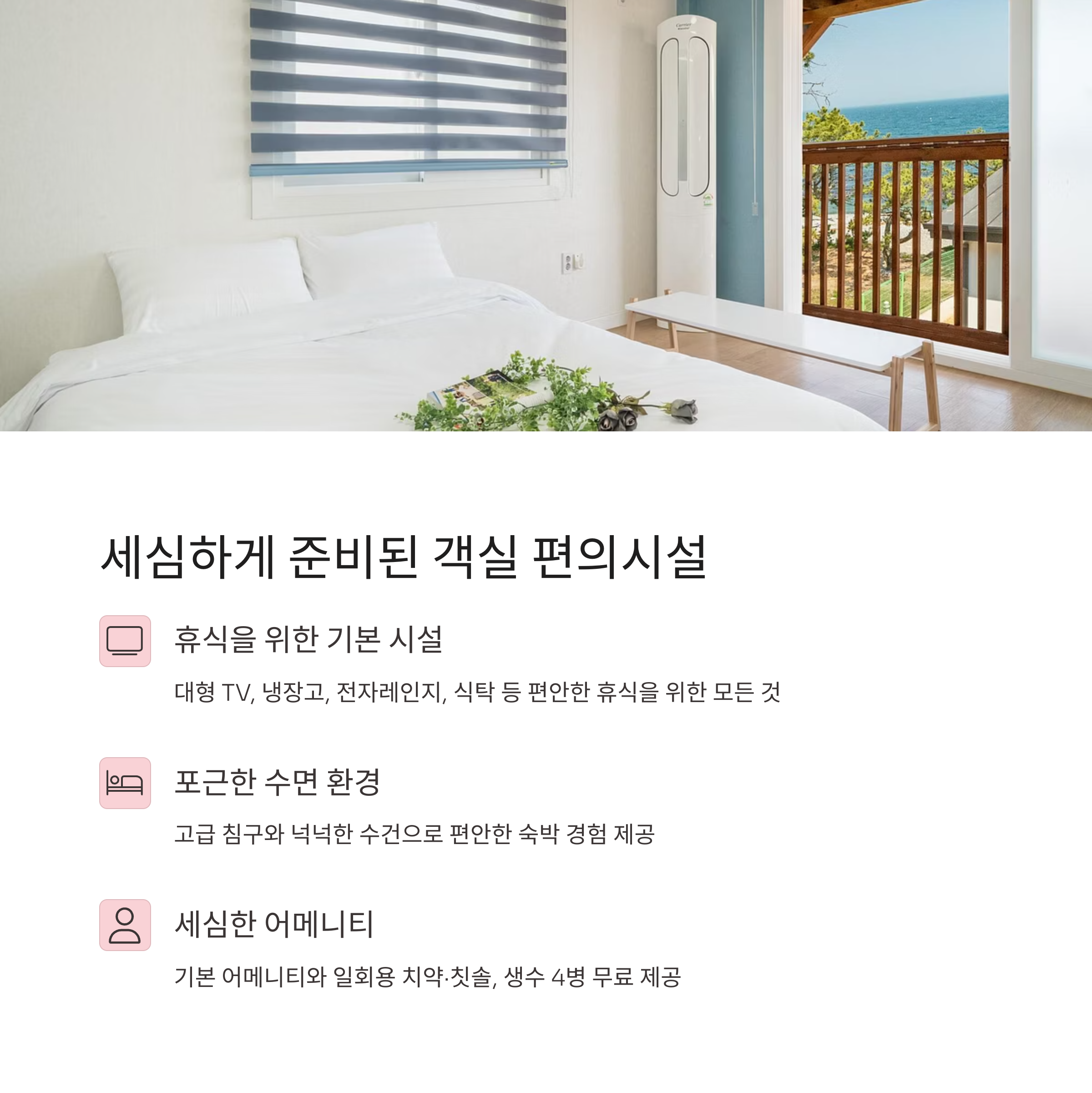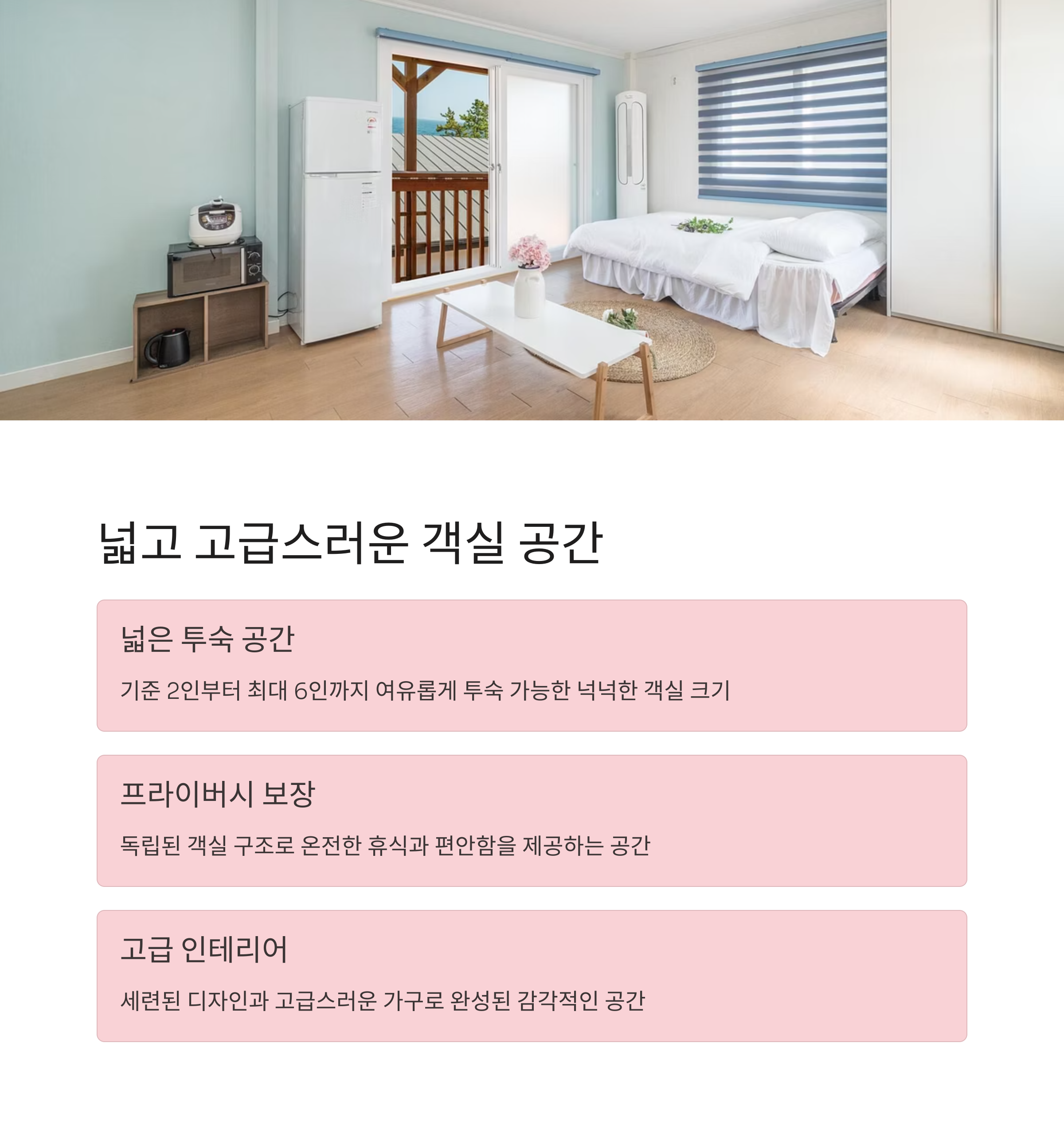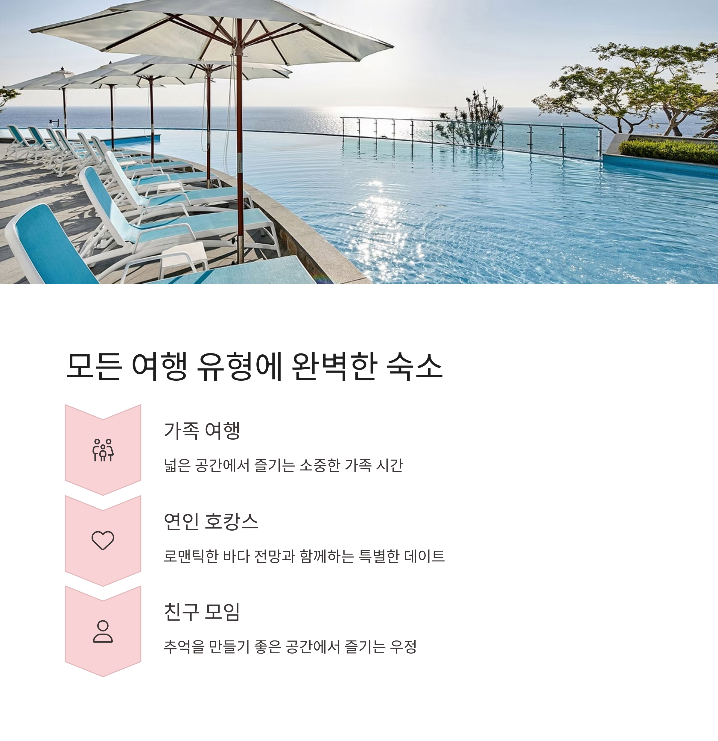 | 숙소 구성 | 기준 2인 ~ 최대 6인, 풀빌라 객실, 바다 뷰 통창, 야외 수영장 |