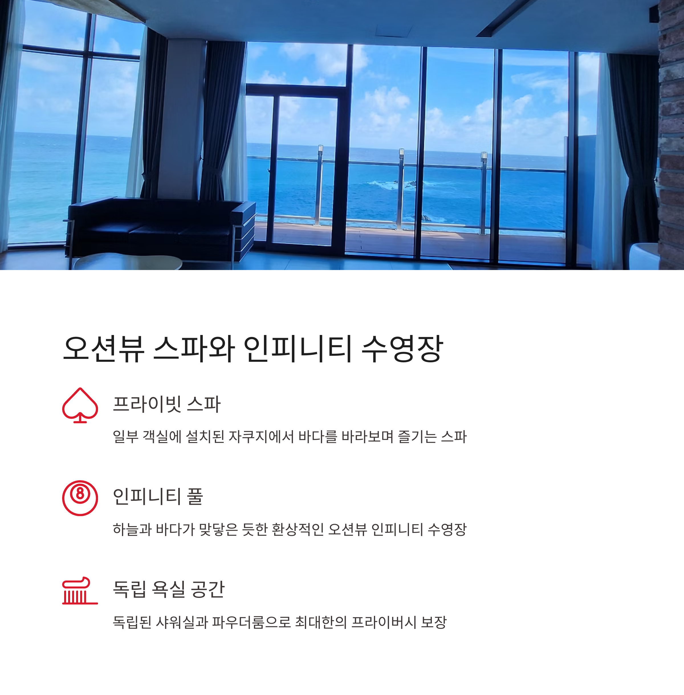 | 바다 전망 통창, 전 객실 오션뷰 | 스파욕조와 야외 수영장 구비 | 최대 6인, 가족 여행에 적합 |