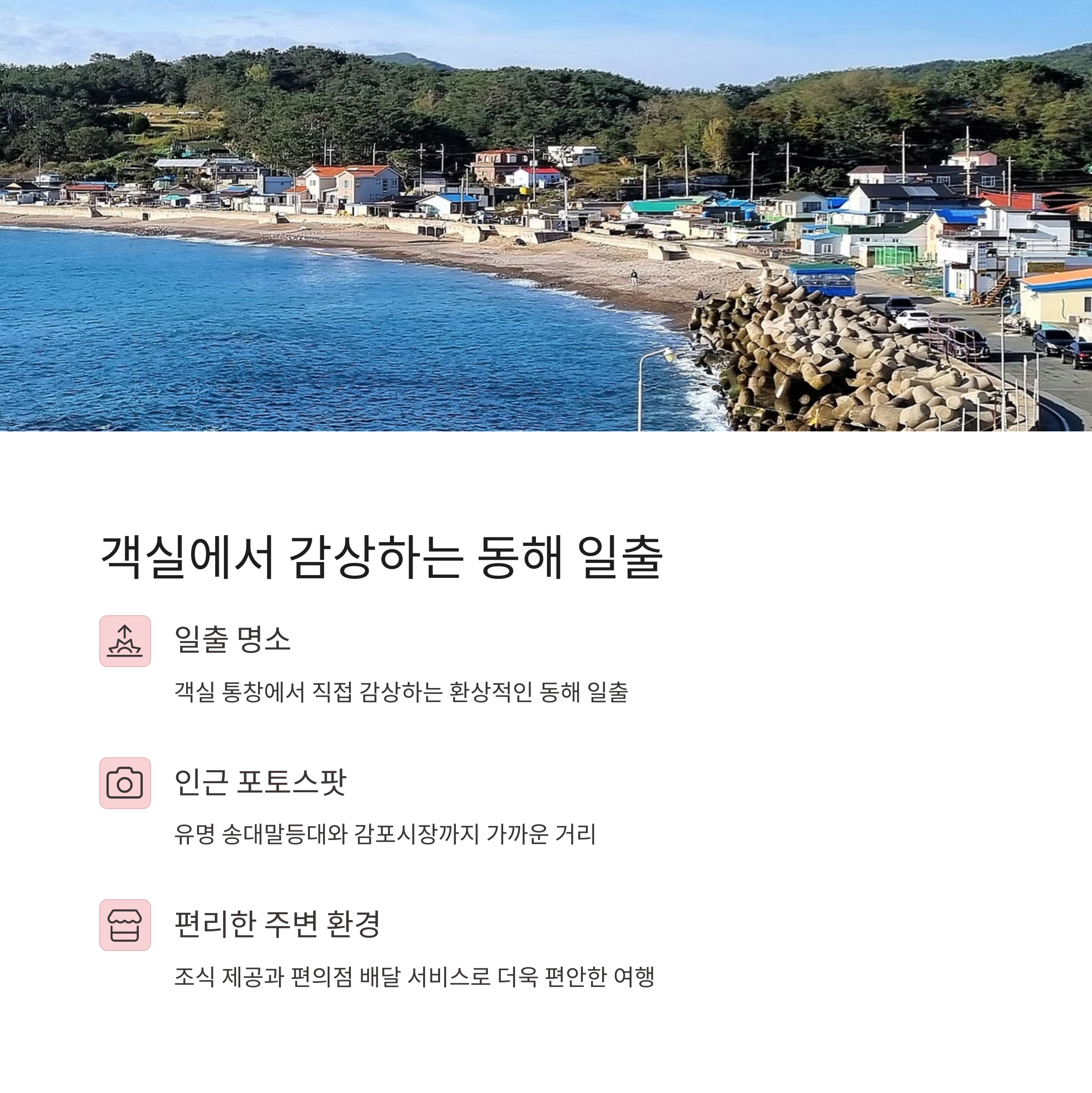 | 침구, 수건, 어메니티 고급 관리 | 감포 일출 감상 가능 | 신혼여행, 기념일 여행에도 추천 |