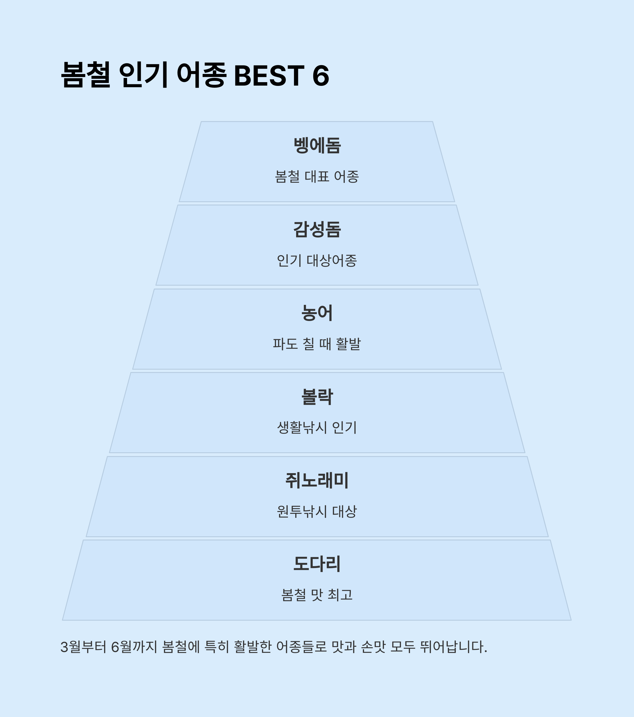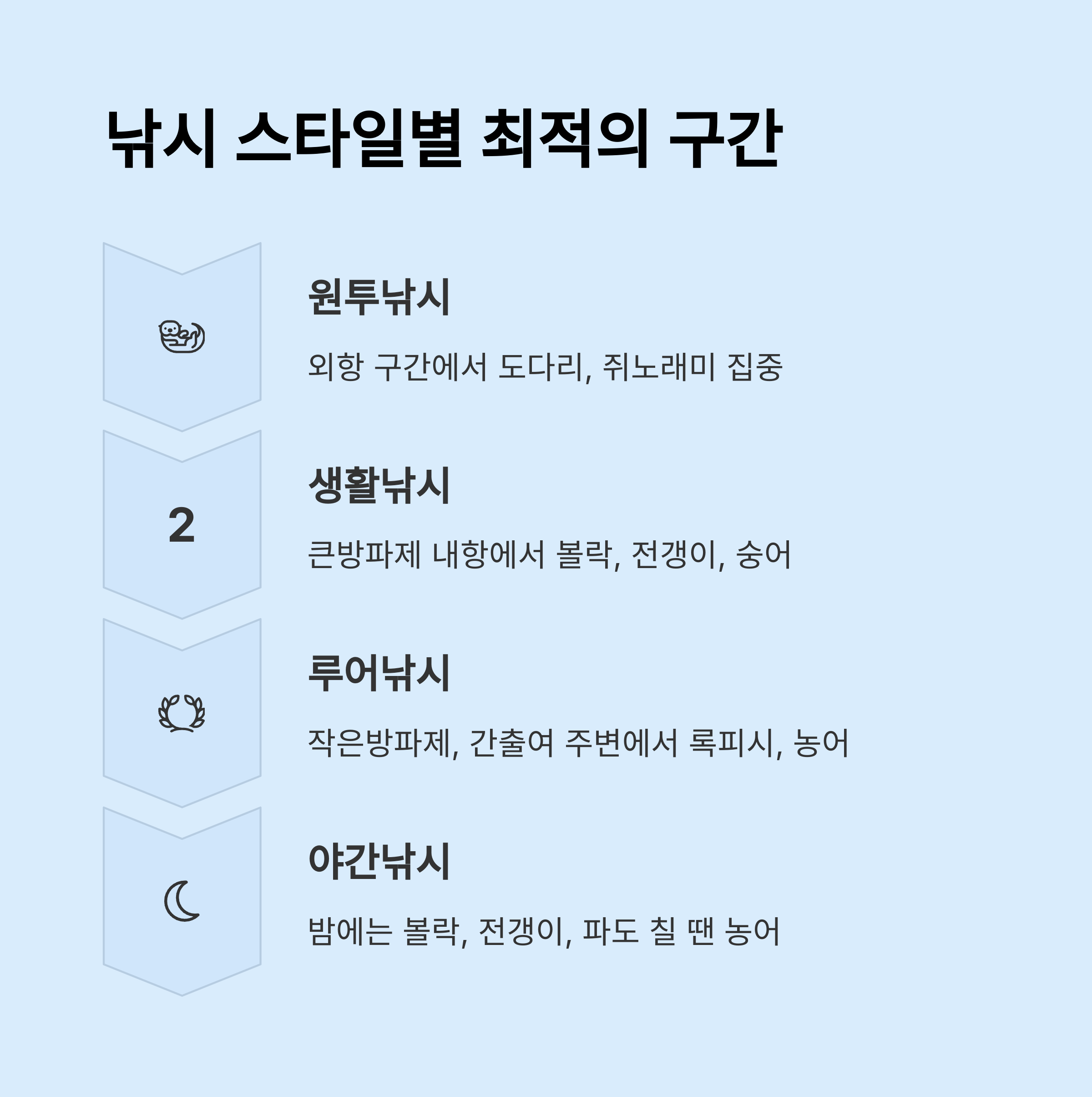 | 도다리·쥐노래미는 자갈밭에서 원투낚시 공략 | 간출여는 싱킹펜슬 등 장거리 캐스팅 유리 | 새벽·밤 출조 시 서풍·북풍이 입질에 효과적 |