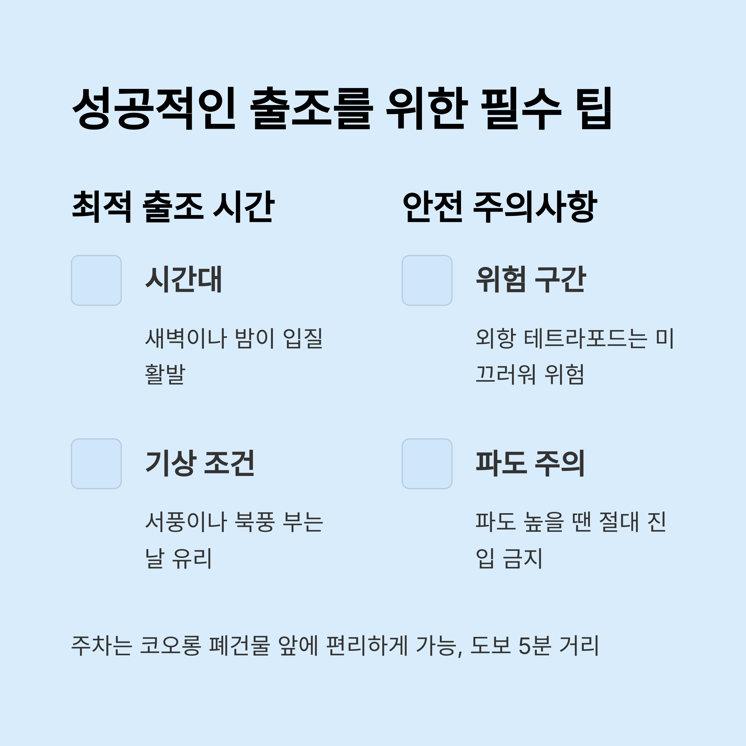 새벽과 밤 출조 시 서풍·북풍이 불면 입질 확률이 높고, 만조 전후의 물돌이 시간대를 노리는 것이 효과적입니다. 테트라포드 구간은 조과가 뛰어나지만 매우 미끄럽고 추락 위험이 있어 안전장비 필수입니다. 내비게이션에는 ‘지경방파제’를 입력하면 편하게 도착 가능하며, 현장 상황에 따라 소형 차량 진입 및 간단한 장비 이동이 유리합니다. 포인트 다양성, 어종 풍부함, 사계절 활용 가능성에서 동해안 낚시 마니아들에게 강력 추천되는 명소입니다.