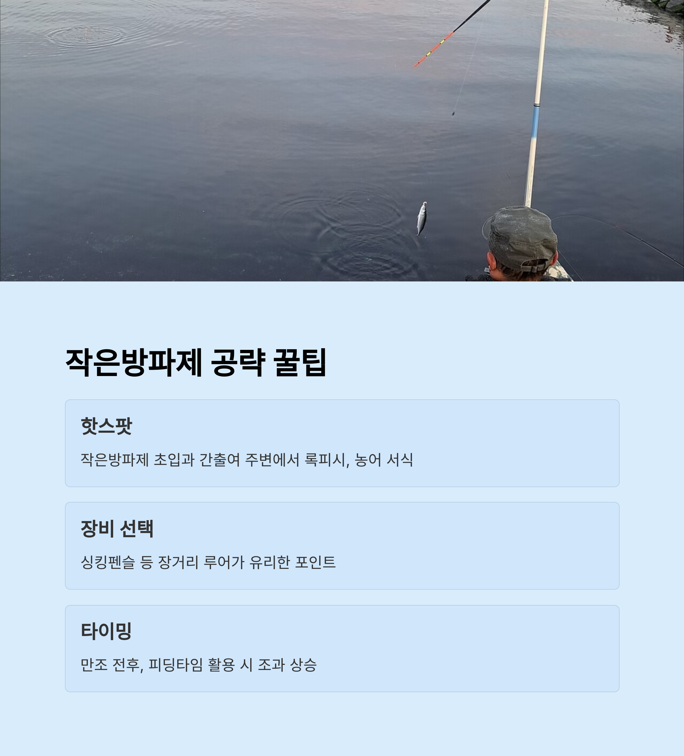 | 작은방파제 끝과 큰방파제 외항에서 조과 우수 | 파도 칠 때 외항·간출여 구간에서 히트 확률 높음 | 내항에서 볼락, 전갱이, 숭어 등 낚시 가능 |