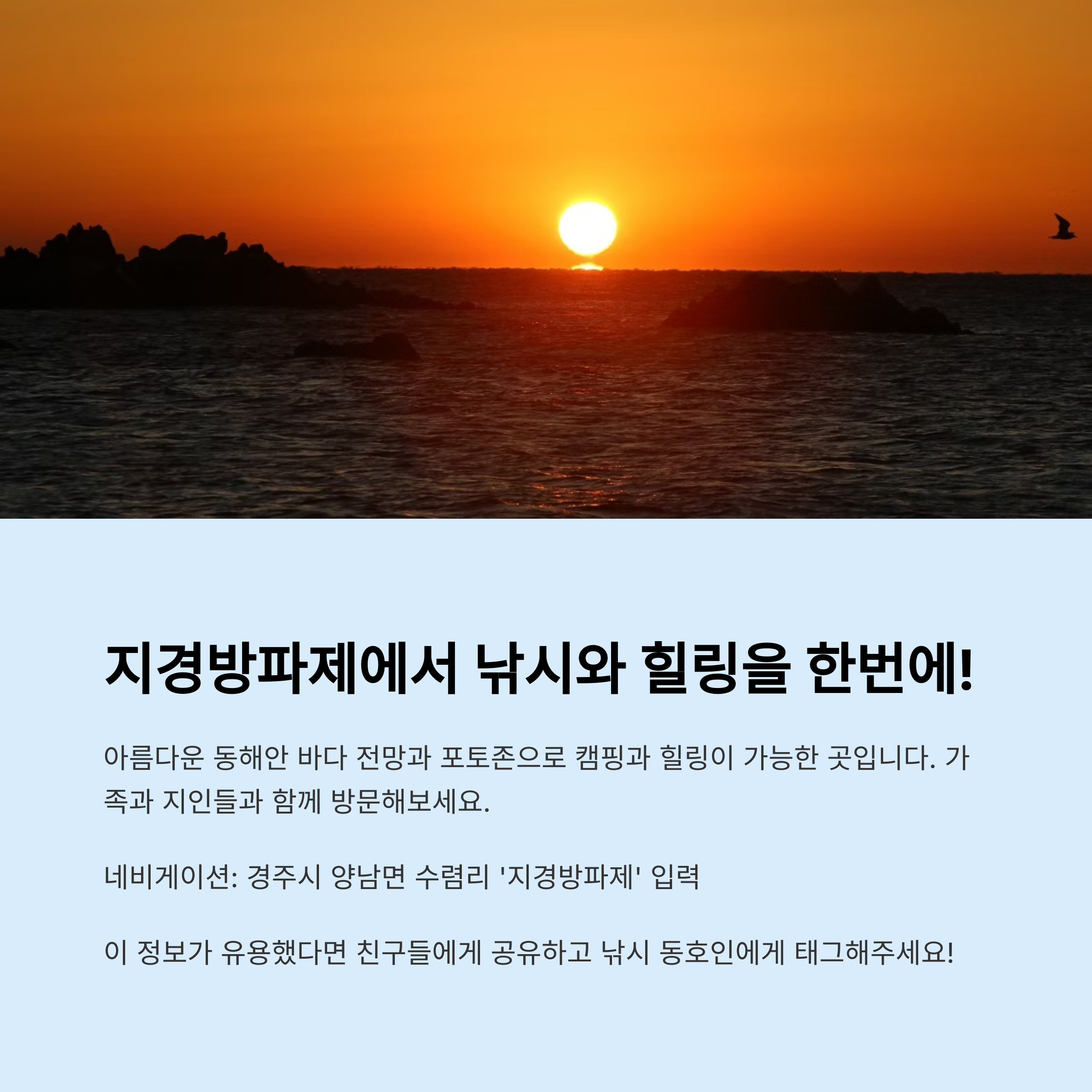 | 위치 정보 | 경주시 양남면 수렴리 558-3, 내비에 ‘지경방파제’ 입력 |