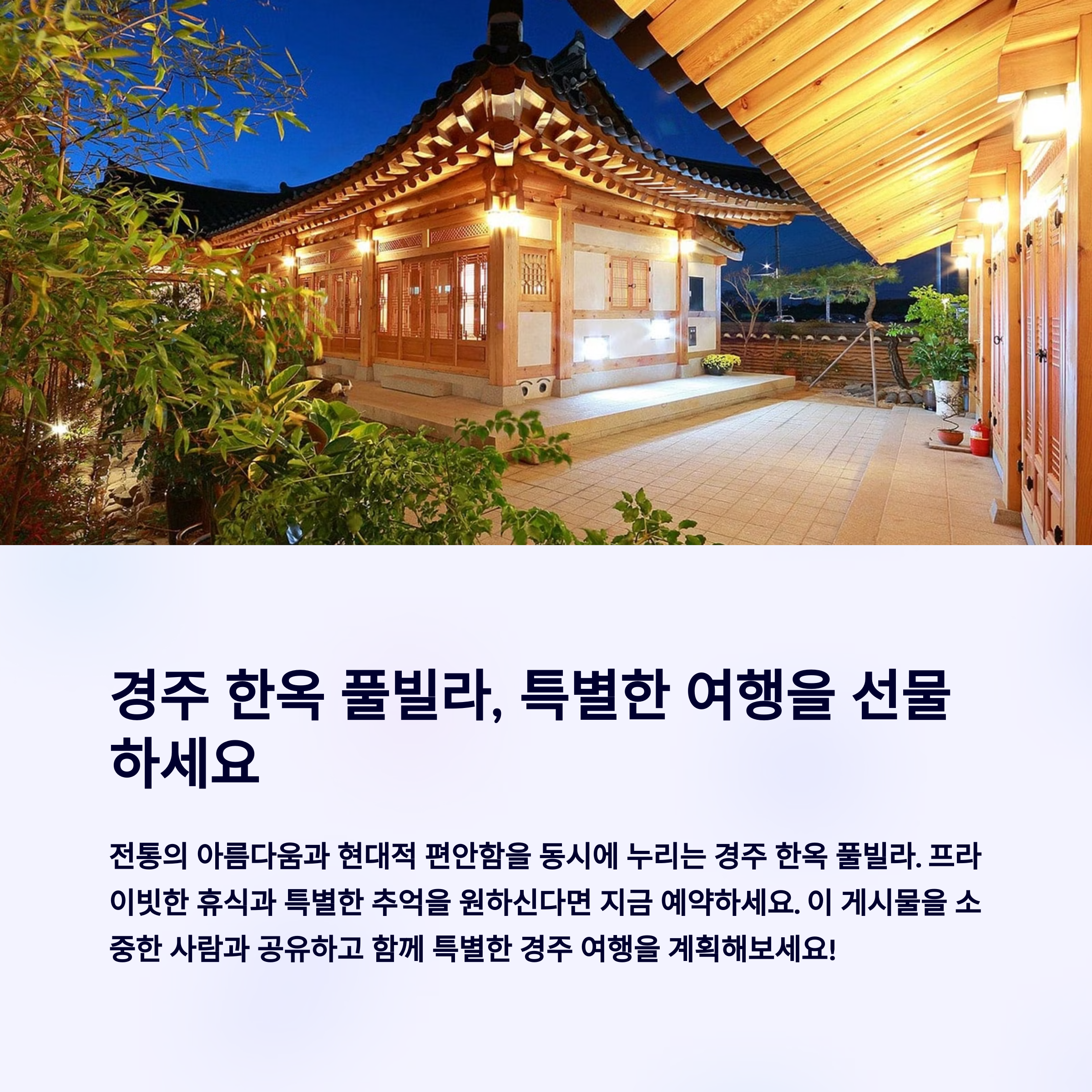 경주는 단순히 여행을 즐기기 위한 도시를 넘어 고즈넉한 풍경과 역사의 향기를 가득 담고 있는 공간입니다. 그 중심에서 머무는 숙소는 여행의 품질을 결정짓는 중요한 요소 중 하나로 작용합니다. 한옥 감성과 현대적 시설이 완벽히 조화를 이룬 포석정 근처 풀빌라 숙소들은 방문객들에게 잊지 못할 시간을 선사합니다. 실내외 편의시설은 물론 청결도, 위치, 서비스 모든 면에서 뛰어난 평가를 받고 있어, 경주를 방문하는 누구에게나 자신 있게 추천드릴 수 있는 공간들입니다.