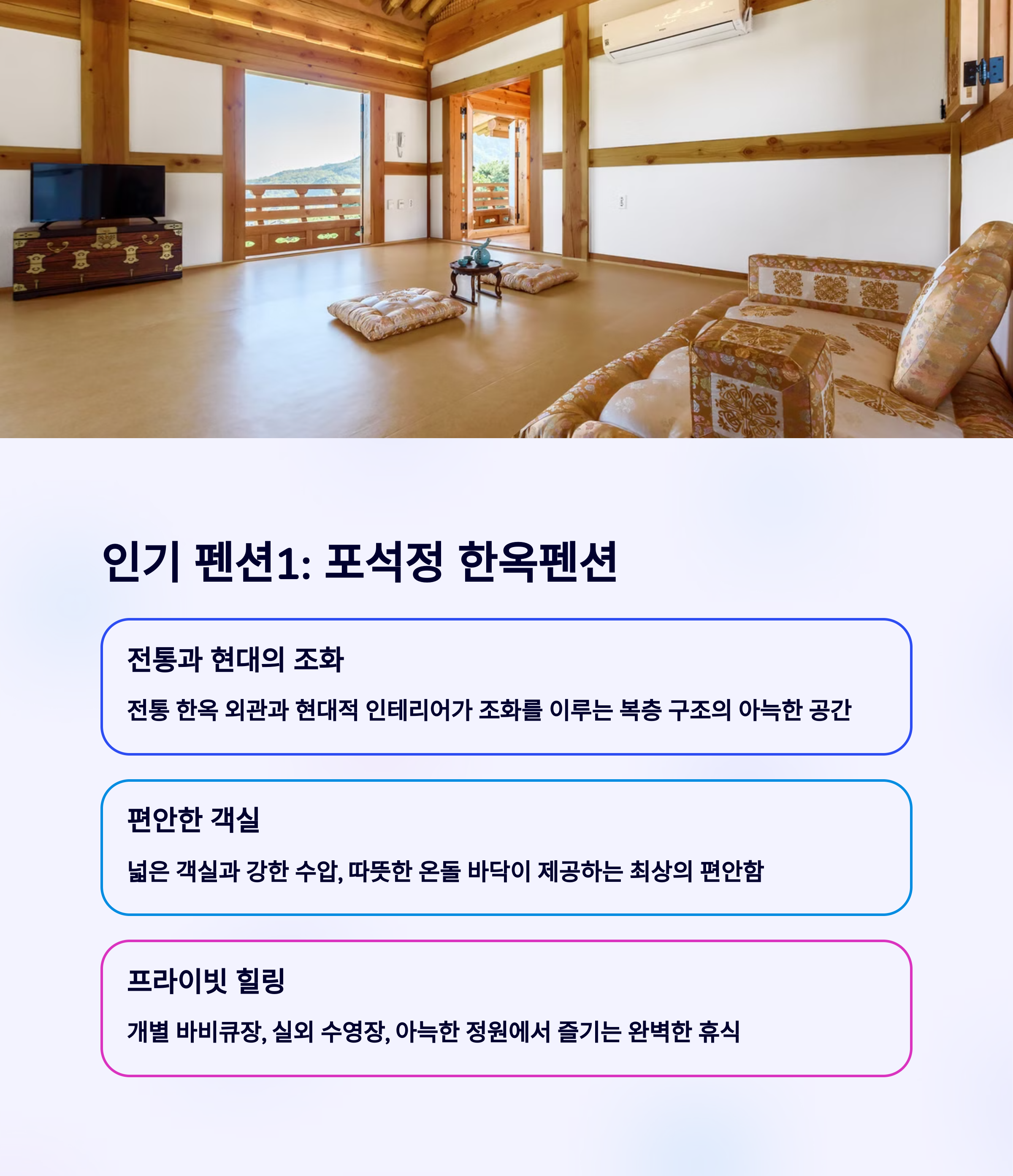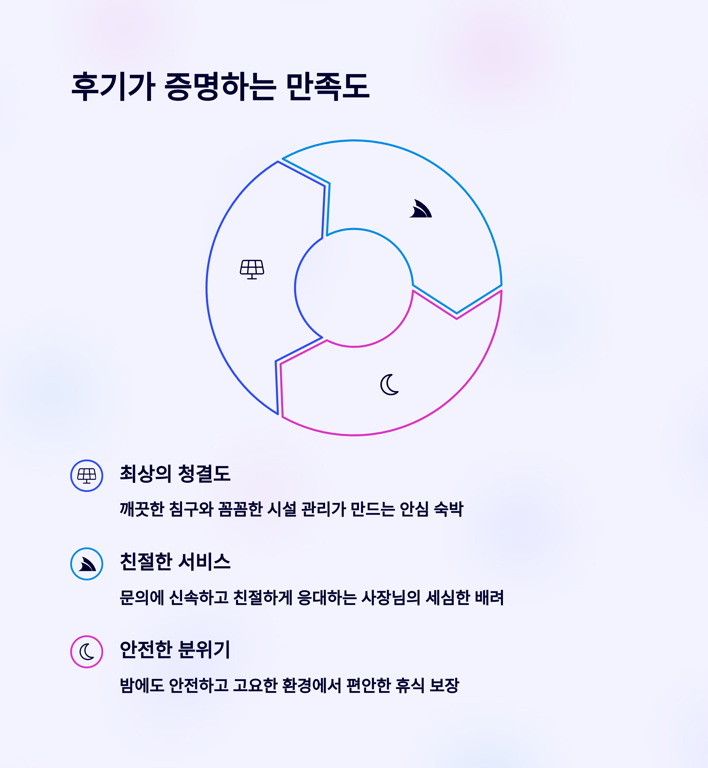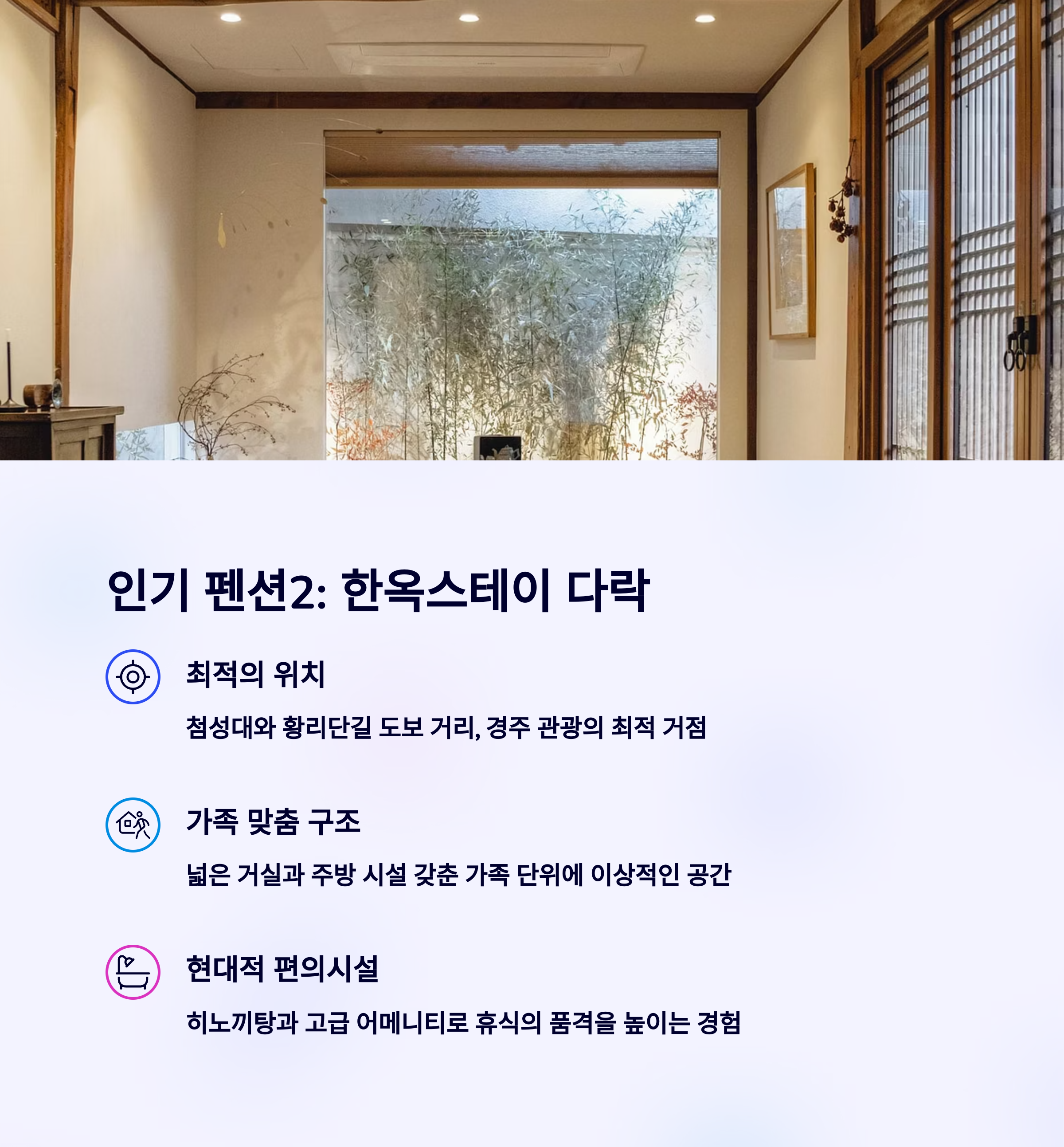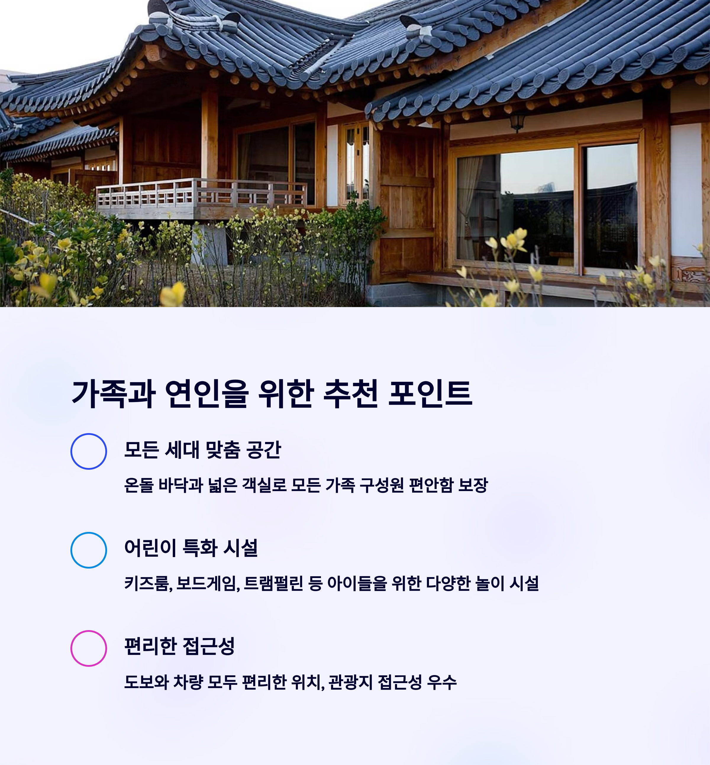 | 가족 여행에 최적화된 구조 | 깔끔한 청결과 친절한 응대 | 감성적인 한옥 인테리어 |
