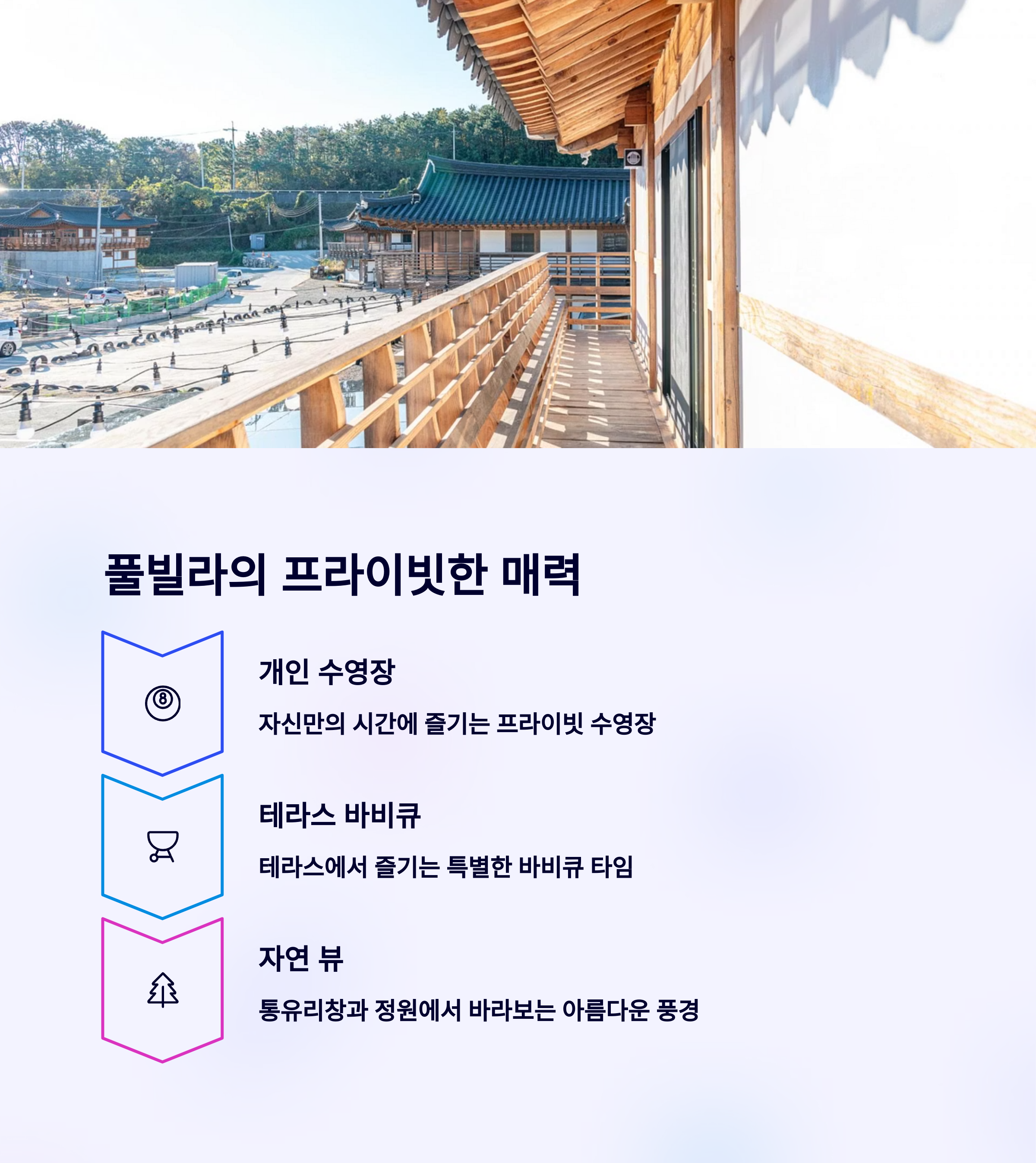 | 프라이빗 수영장 포함한 숙소 | 전통미와 현대미 공존 공간 | 관광지 접근성 우수한 위치 |