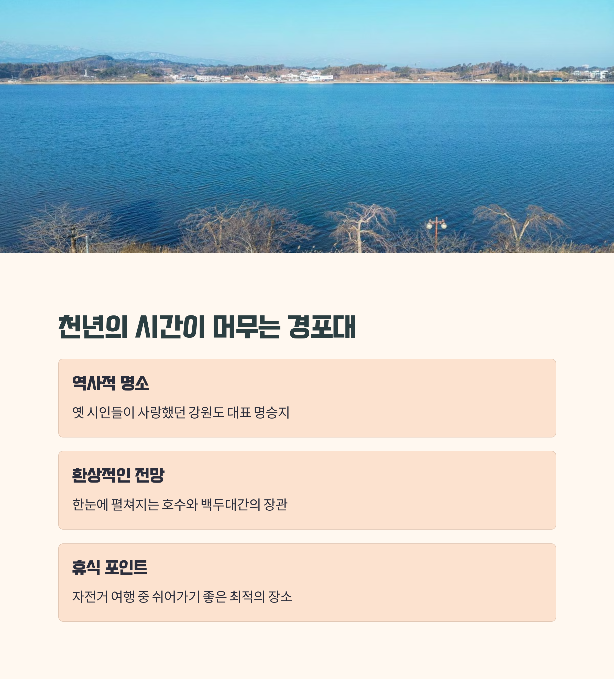 자연과 함께하는 여행을 원한다면 경포대 자전거 코스는 그야말로 최고의 선택입니다. 바람을 가르며 호수를 따라 여유롭게 달리고, 역사와 문화 명소까지 둘러보는 이 코스는 강릉 여행의 진가를 느끼게 해줍니다. 자전거 페달을 밟으며 만나는 경포호의 풍경, 오늘 하루는 느리게, 그리고 아름답게.
