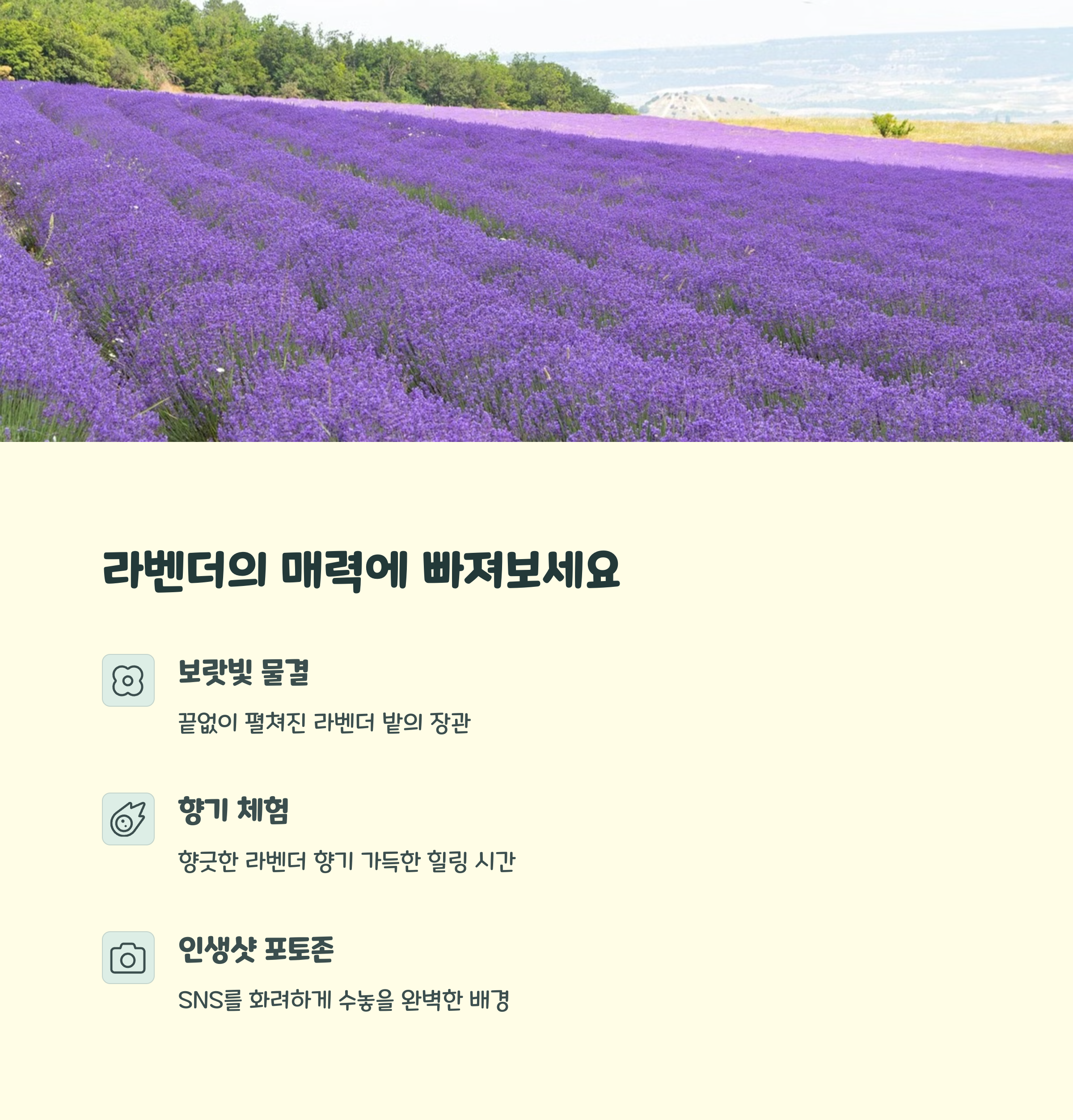여행을 계획 중이라면, 두 축제의 겹치는 시기인 6월 중순에 고성을 찾는 것이 가장 이상적입니다. 단, 라벤더의 개화 시기는 기후에 따라 다소 변동될 수 있으므로, 공식 SNS나 하늬팜 홈페이지를 통해 실시간 개화 상황을 확인하는 것이 좋습니다. 아침 시간대는 비교적 한산하고 햇살도 부드러워 사진 촬영에 더욱 적합합니다.