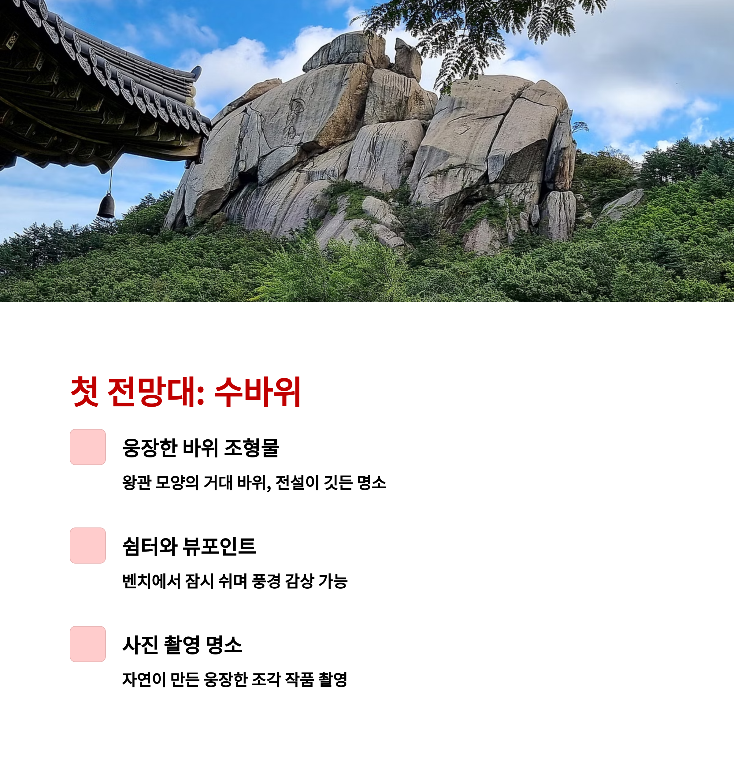 트레킹 중간에는 전통찻집 '란야원'이 있어 고즈넉한 산사 분위기 속에서 수바위를 바라보며 차 한 잔의 여유를 즐길 수 있습니다. 직접 달인 한방차와 간단한 다과가 제공되며, 차 마시는 공간도 조용하고 아늑해 많은 방문객들이 코스 후반의 휴식 포인트로 추천합니다. 사찰 특유의 고요함이 마음까지 차분하게 만들어주는 특별한 쉼입니다.