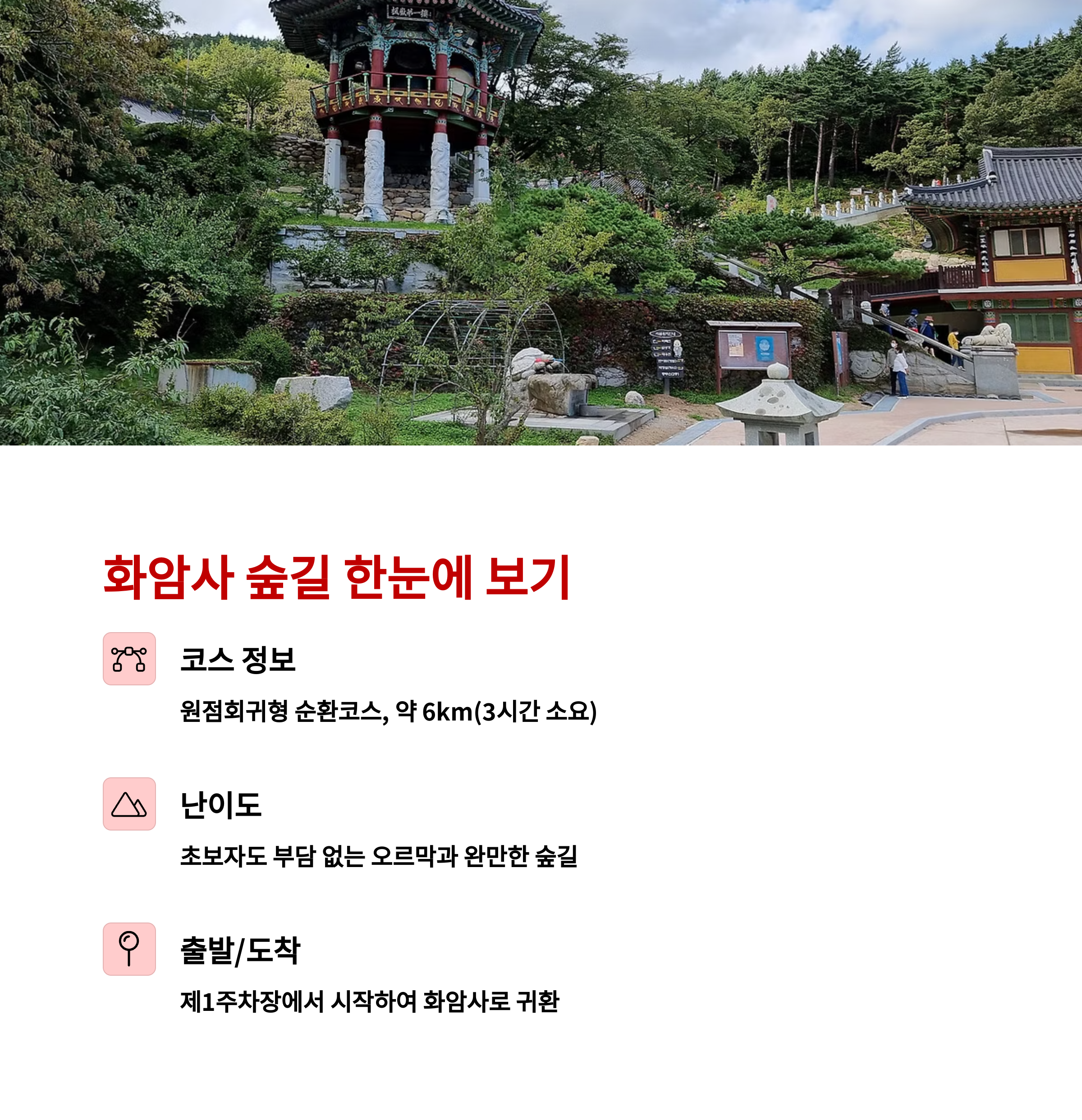 | 추천 코스 | 화암사 숲길(6km, 3시간) / 수바위·신선대·전망대 순환 산책 |