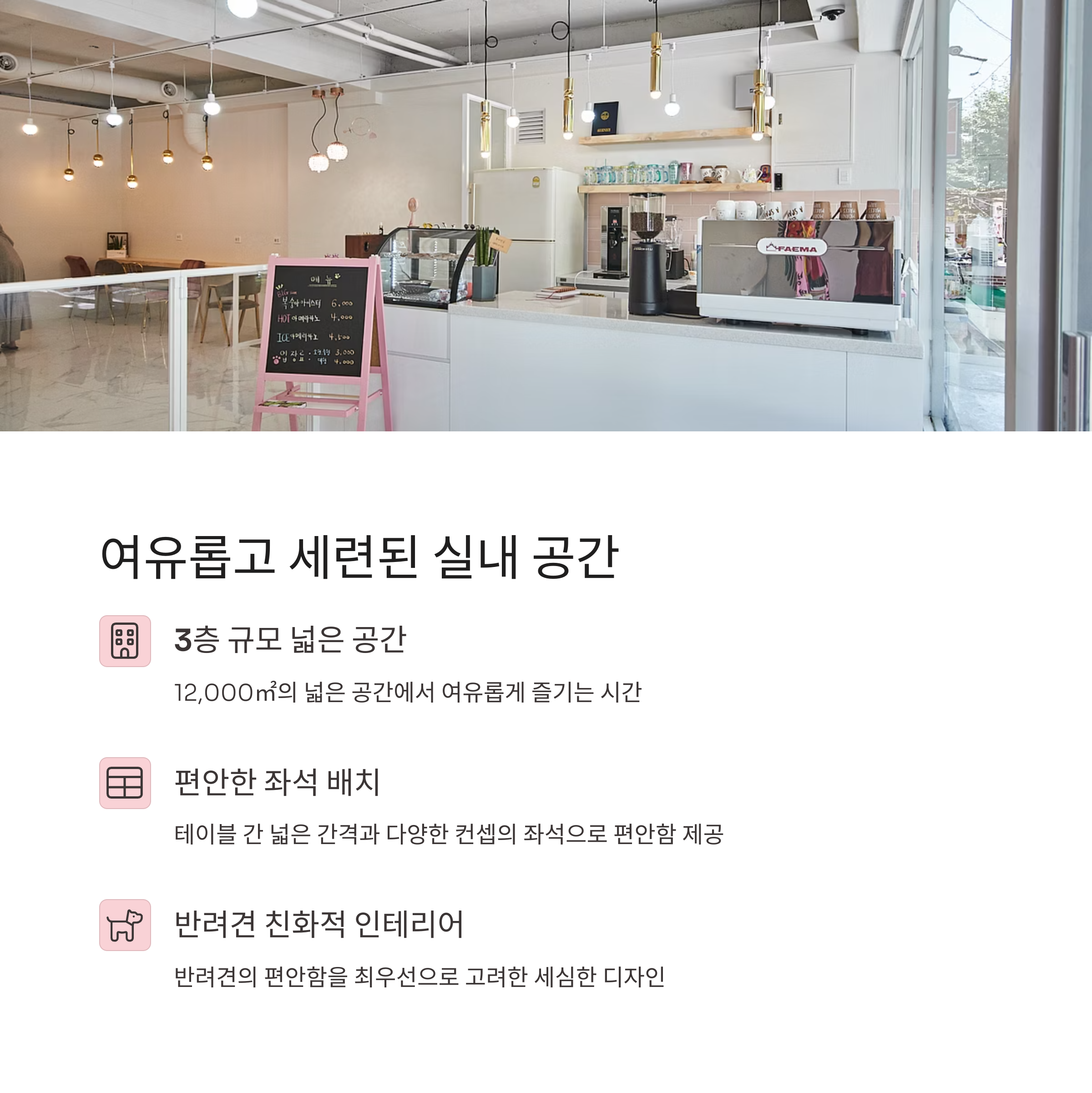 실내 공간은 쾌적하고 청결하게 유지되며 테이블 간 간격이 넓어 반려견과의 여유 있는 시간을 보내기에 좋습니다. 공기청정기, 냉·난방, 위생 매트 등이 철저하게 관리되고 있어 날씨와 계절에 관계없이 언제든지 방문하기 좋습니다. 특히 셀프 목욕장이 별도로 마련되어 있어 운동 후 간단하게 샤워 및 드라이까지 한 번에 해결할 수 있다는 점도 방문객들 사이에서 호평받는 이유 중 하나입니다.