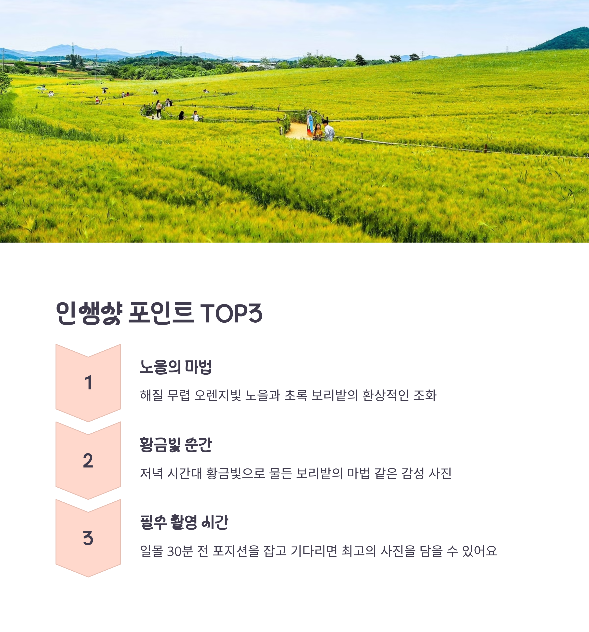 | 인생샷 포인트 | 보리밭 산책로, 유채꽃 존, 노을 포인트가 인기예요 |