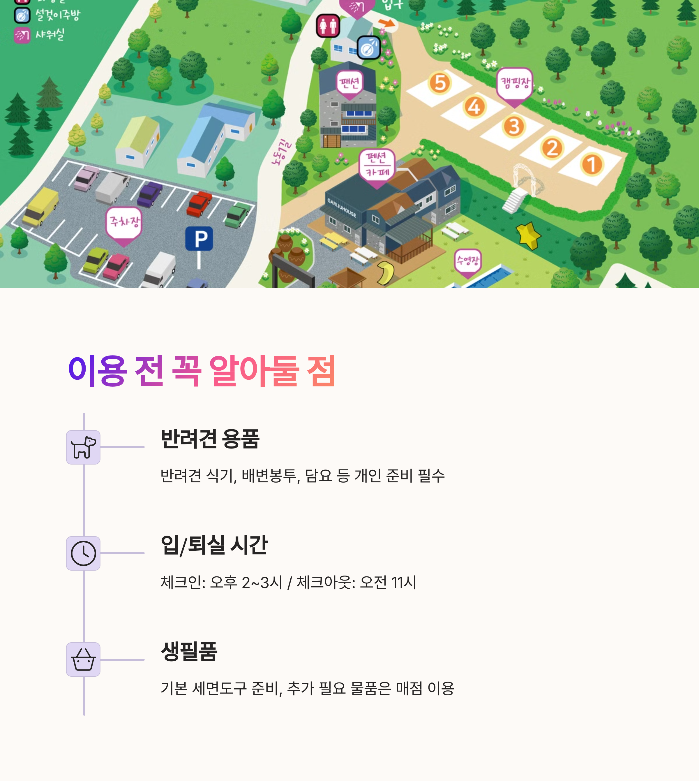 텐트 앞 주차, 매점, 전자레인지 부스 반려견 어메니티는 별도 준비 가족·연인·반려견 모두 만족