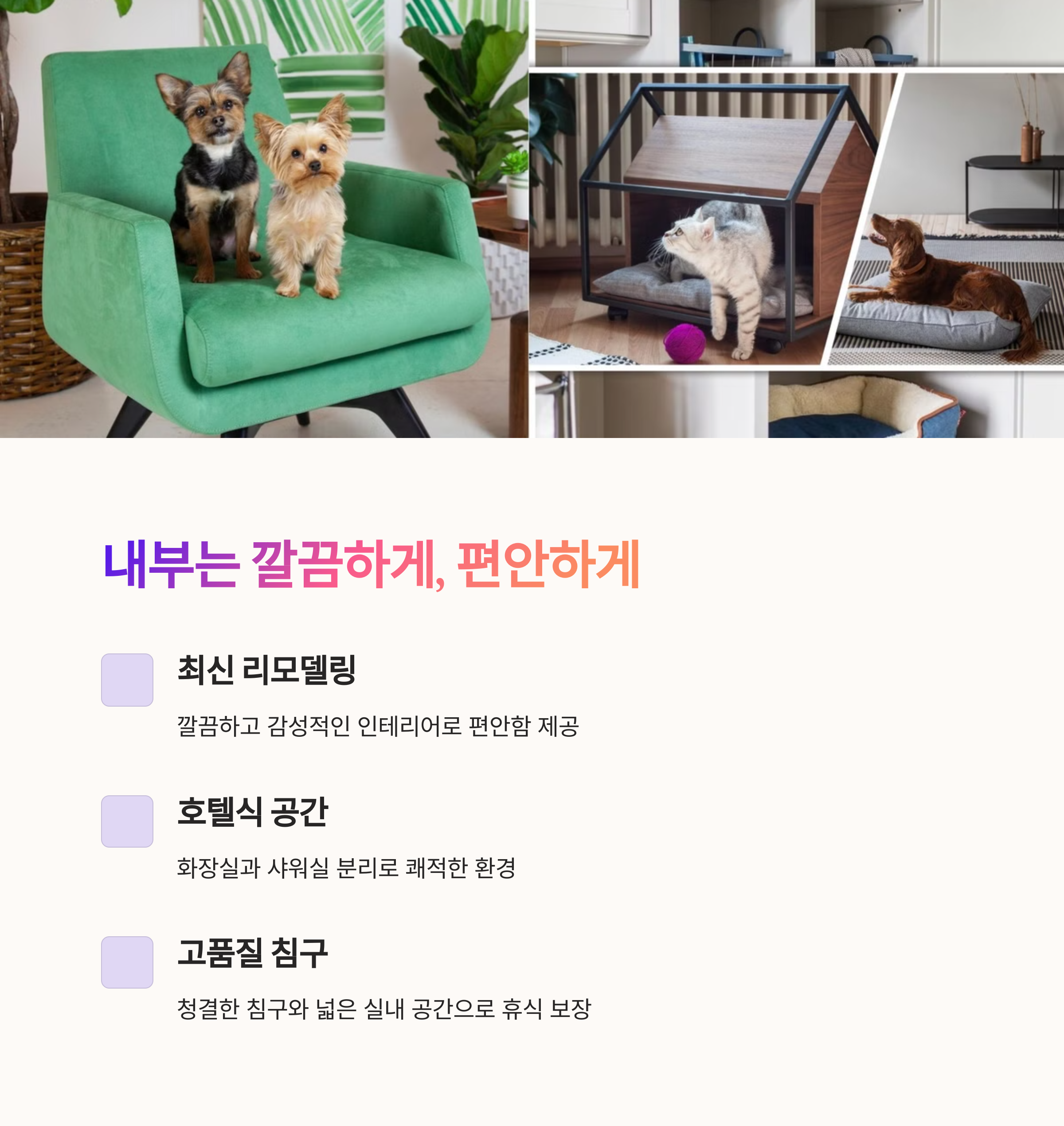 드림동은 애견동반 가능 객실이며, 반려견 동반 시 마리 수에 따라 소정의 추가 요금이 발생할 수 있습니다. 예약 시 반드시 반려견 동반 여부를 사전 고지해주세요.