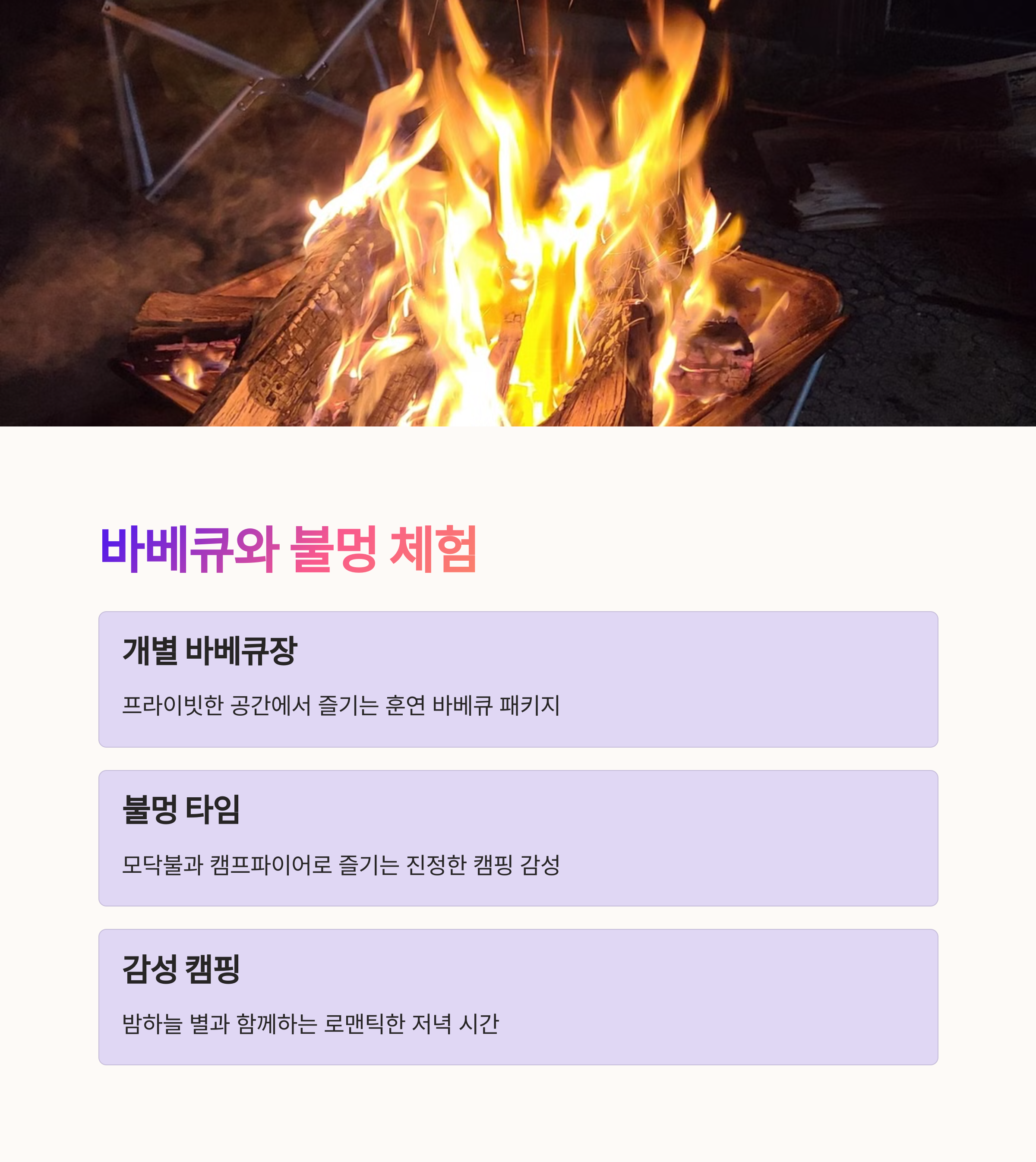 주요 특징 애견동반 가능, 전 객실 리모델링, 불멍·바비큐장 등 캠핑 감성 요소 풍부