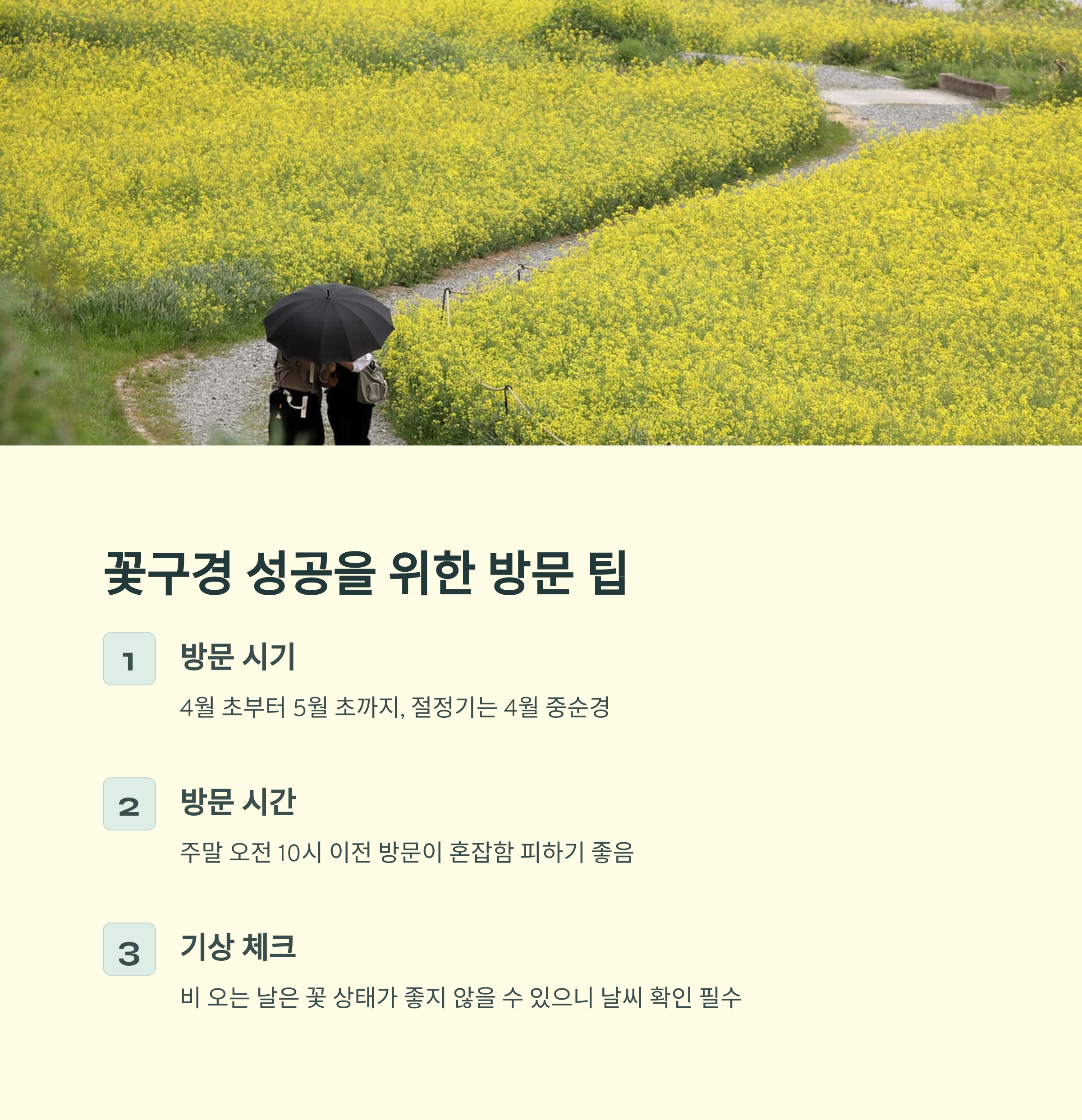 | 유채꽃 시기 | 4월 중순~5월 초까지 절정, 노란 꽃물결 |