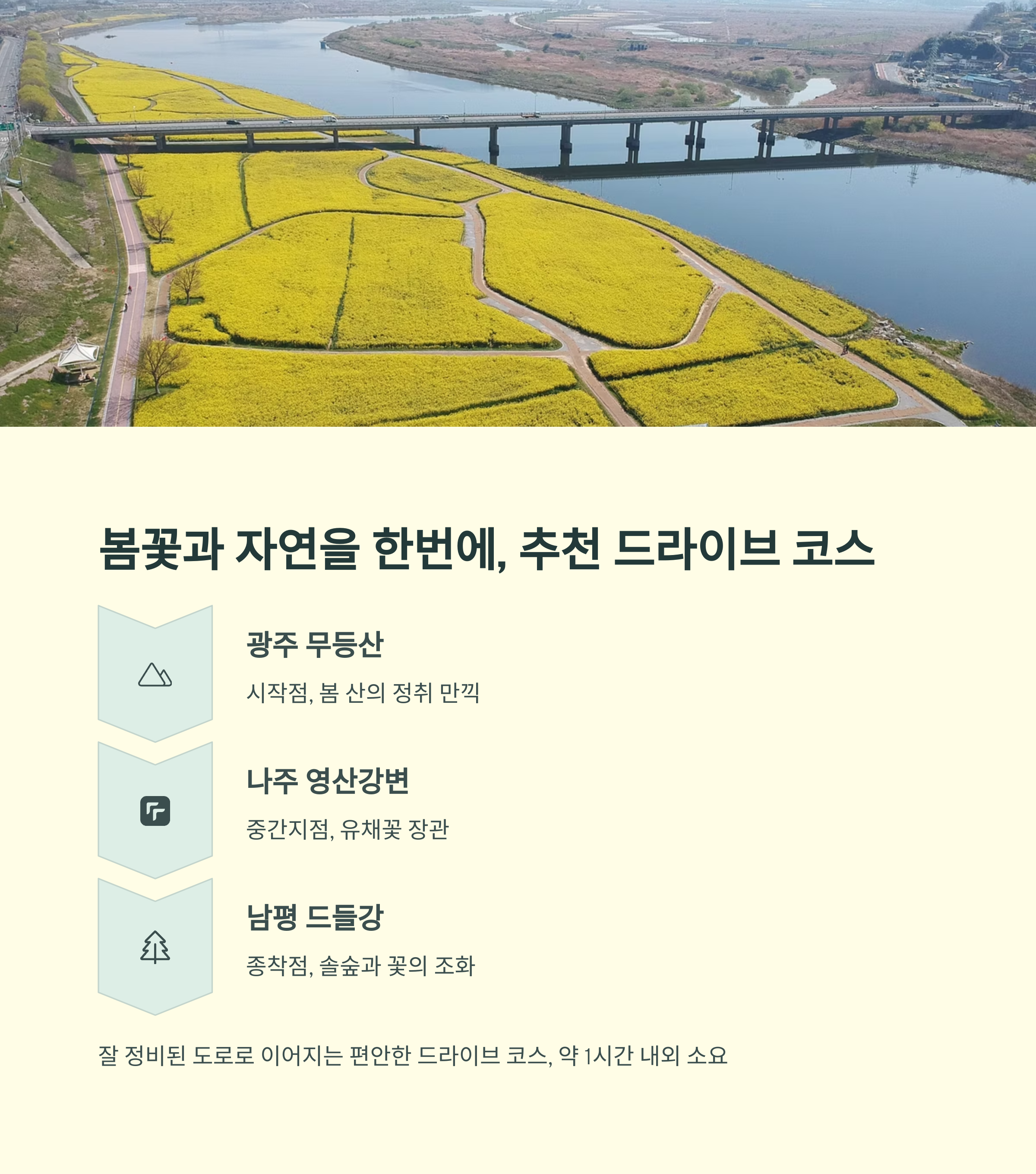 추천 드라이브 루트는 광주 무등산에서 출발 → 나주 영산강 유채꽃 → 남평 드들강 솔밭으로 이어지는 코스입니다. 각 구간은 도로 정비가 잘 되어 있어 초보 운전자도 편하게 이동할 수 있으며, 이동 중간에 카페, 음식점, 화장실도 곳곳에 위치해 있어 하루 코스로 부담 없이 다녀올 수 있습니다. 특히 주말엔 오전 시간대 방문이 주차 및 꽃구경에 여유롭습니다.