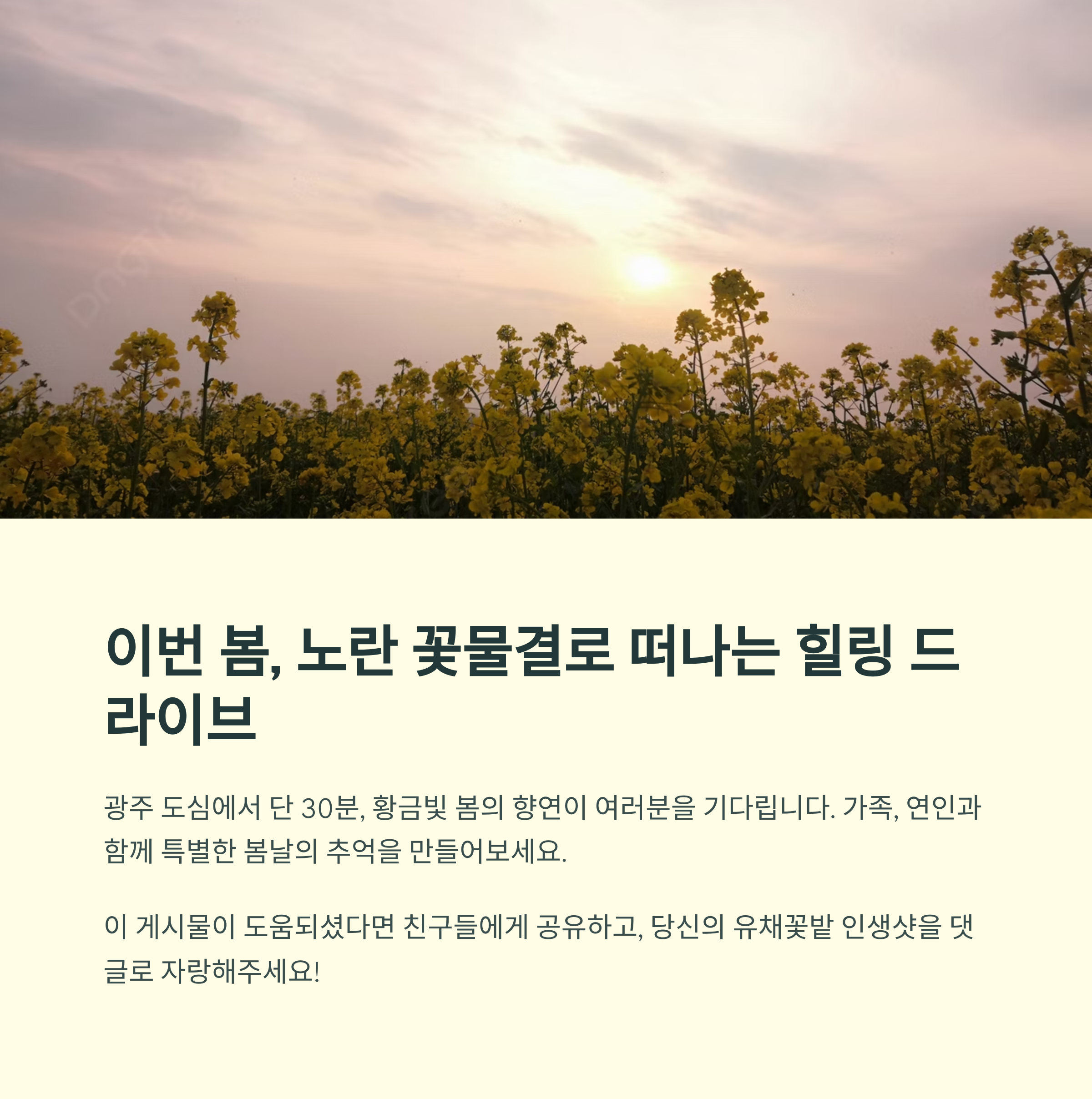 이 유채꽃 드라이브 코스를 다녀오신 분들이라면 꿀팁이나 좋은 촬영 포인트를 댓글로 나눠주세요. 아직 못 가본 분들에게 큰 도움이 될 거예요!