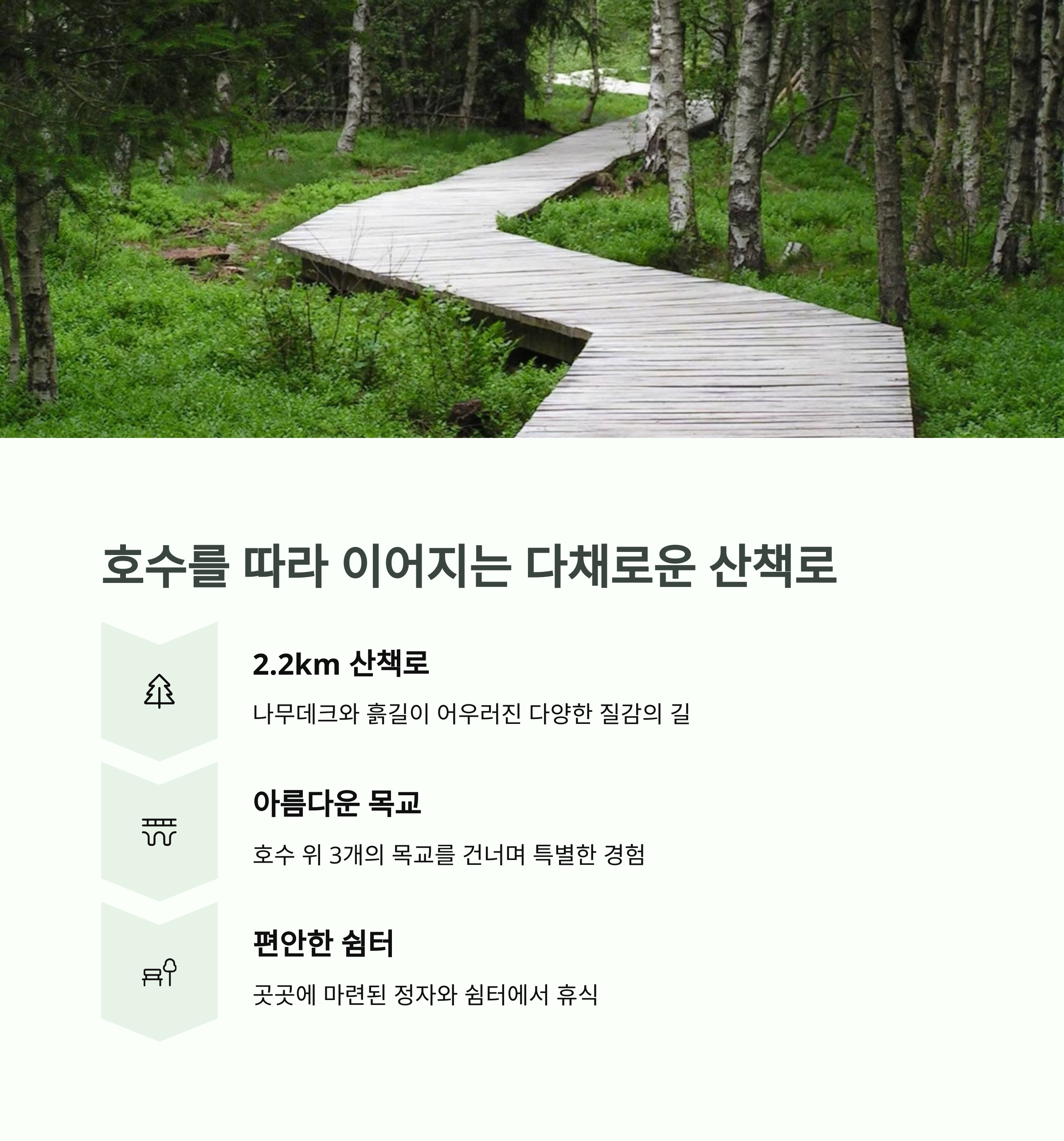 데크길, 흙길, 벤치 쉼터 시화 포토존, 장미터널 호수 목교, 조명 산책길