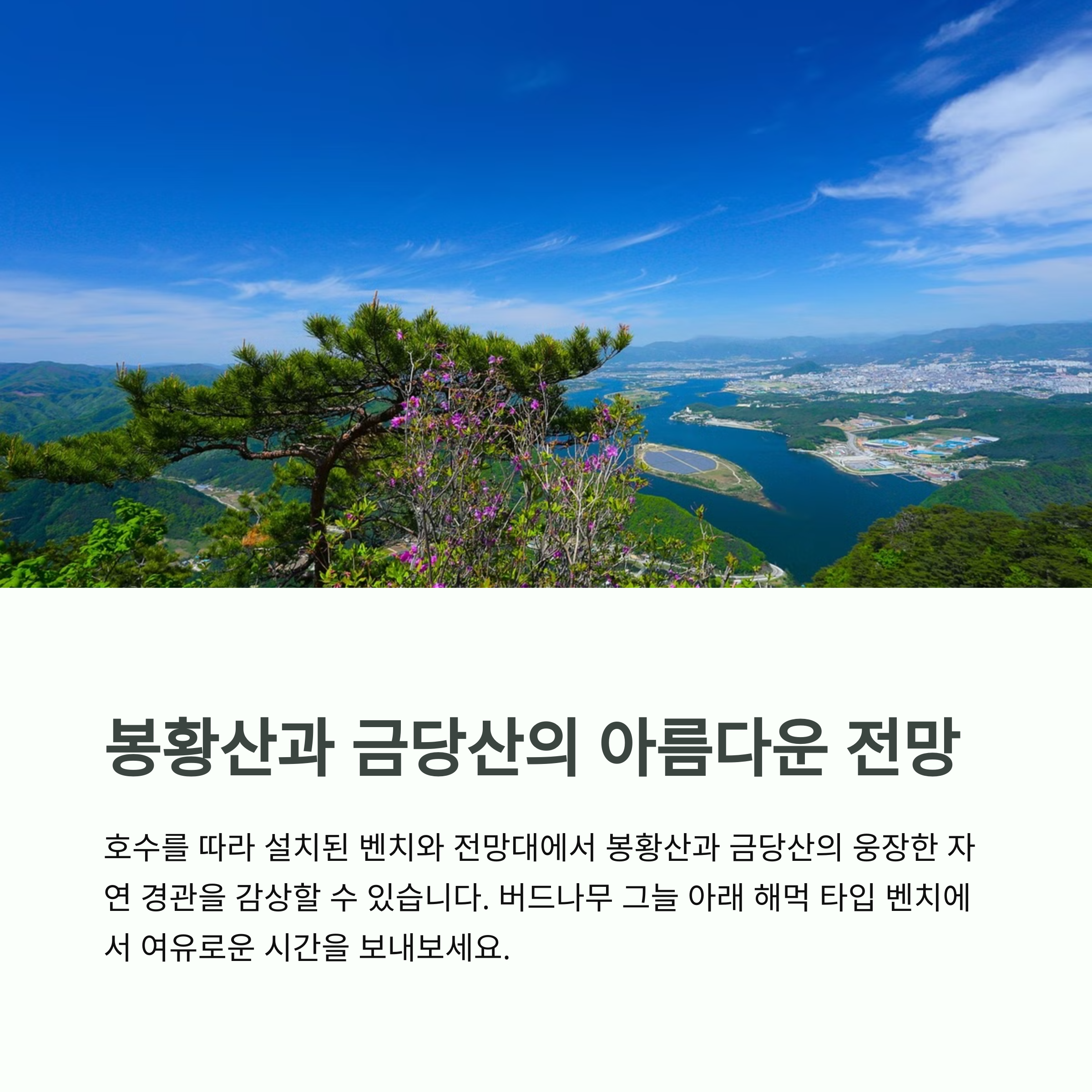 산책로 중간에 마련된 시화 구간은 시인이 직접 쓴 시와 함께 장미꽃이 조화를 이루는 감성 산책 코스로 인기가 높습니다. 시를 읽으며 꽃향기를 맡고, 호수 건너 펼쳐지는 금당산 풍경을 함께 바라보면 마음이 차분해지고 여유로워지는 시간을 보낼 수 있습니다. 특히 시화 옆 의자에 앉아 사진을 찍으면 SNS 감성사진으로도 제격이죠.