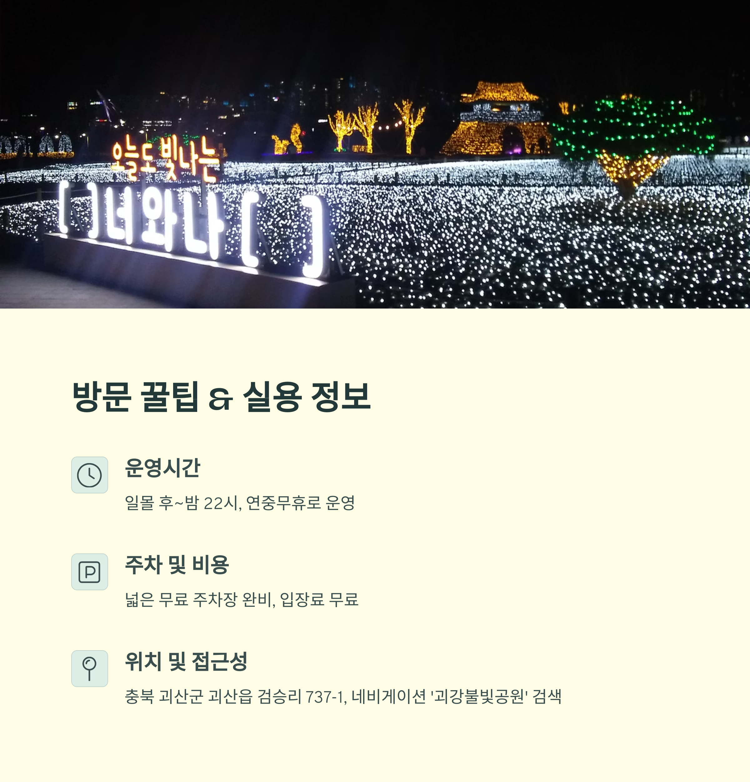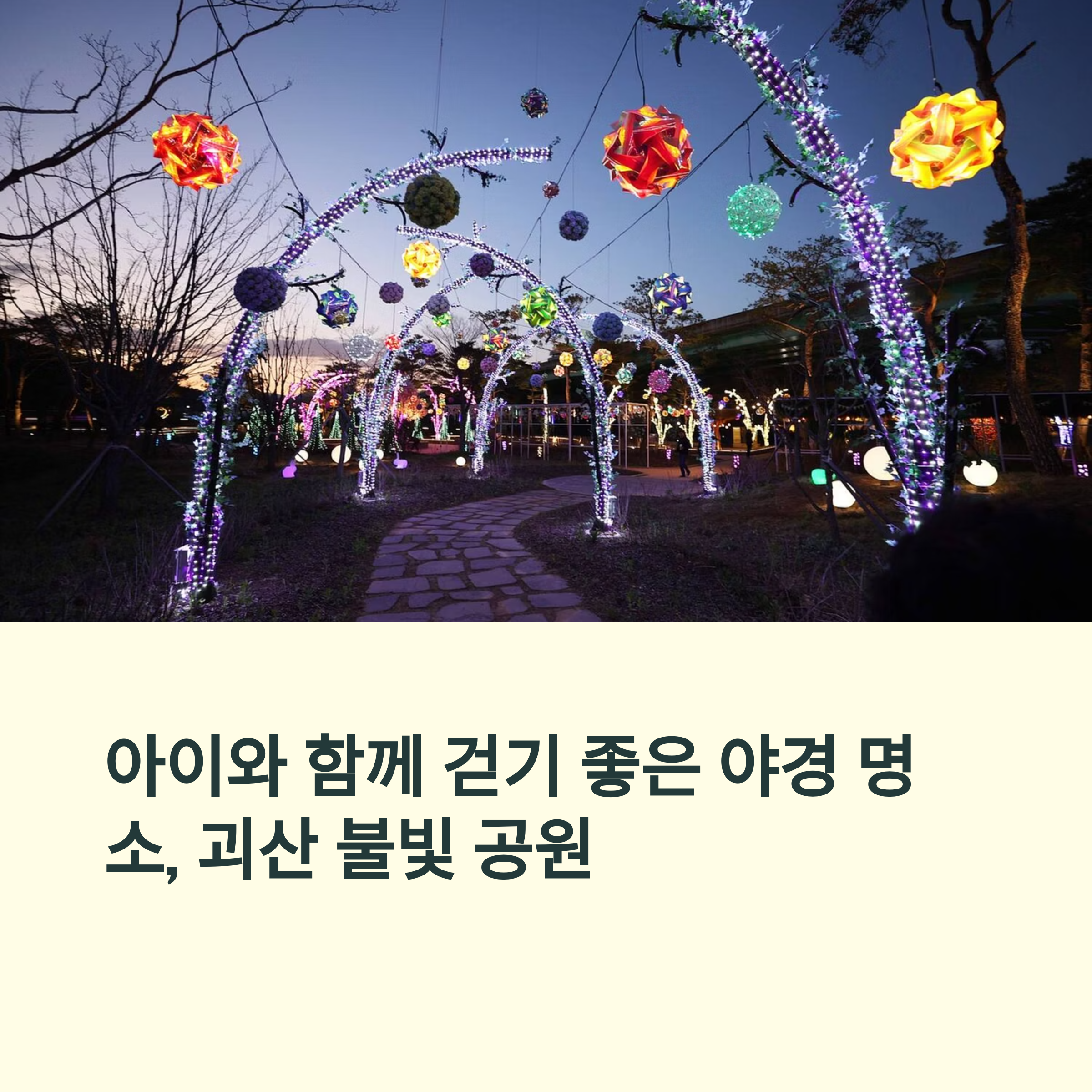 아이들과 함께 특별한 밤 나들이를 계획 중이라면, 괴산 불빛공원은 최고의 선택이 될 수 있습니다. 도심을 벗어나 조용하고 평화로운 분위기 속에서 감성 가득한 조명 산책을 즐기며 가족의 웃음소리를 가득 담을 수 있는 이곳, 괴산에서 빛나는 추억 한 페이지를 만들어보세요.