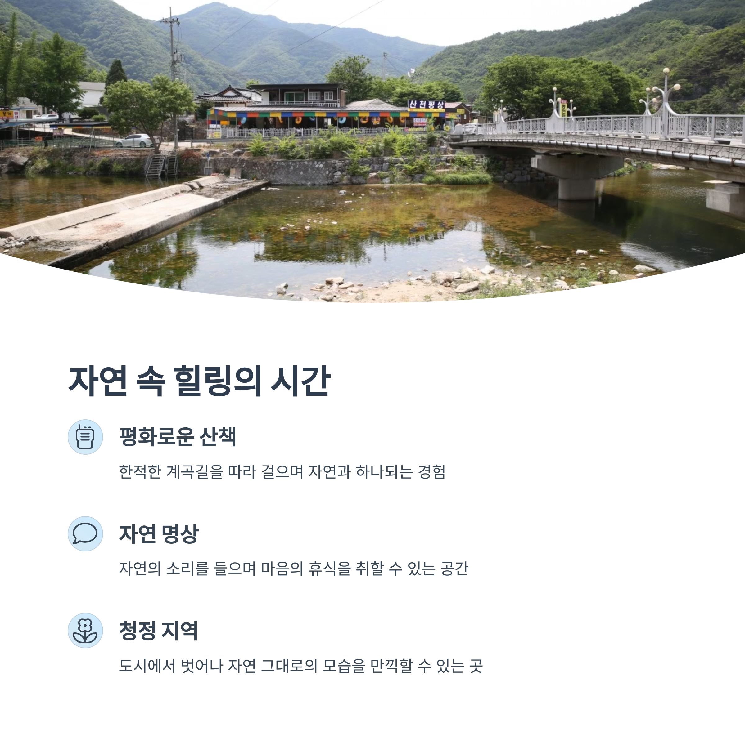 봄에는 새순, 여름에는 꽃과 열매, 가을에는 단풍, 겨울엔 맑은 계곡 풍경까지 사계절 내내 다양한 자연을 만날 수 있어 추천드립니다.