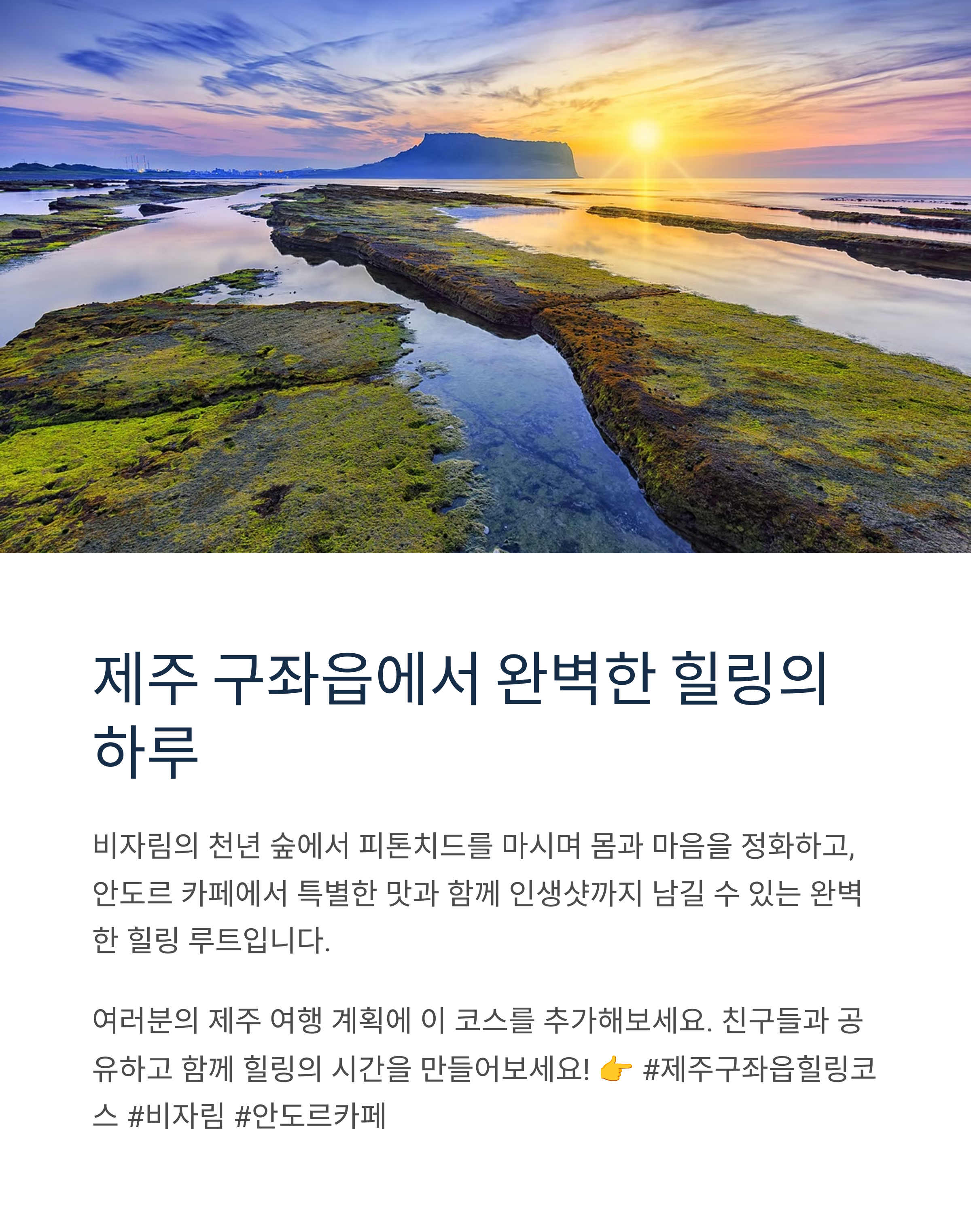 비자림과 안도르 카페는 단순한 관광지를 넘어 쉼과 감성을 모두 만족시켜주는 제주만의 힐링 공간입니다. 천연 숲의 정기를 온몸으로 느끼고 그 여운을 여유로운 카페에서 이어가며 하루를 조용히 정리해보세요. 짧지만 깊은 힐링의 순간을 원한다면 이 루트만큼 완벽한 선택은 없습니다.
