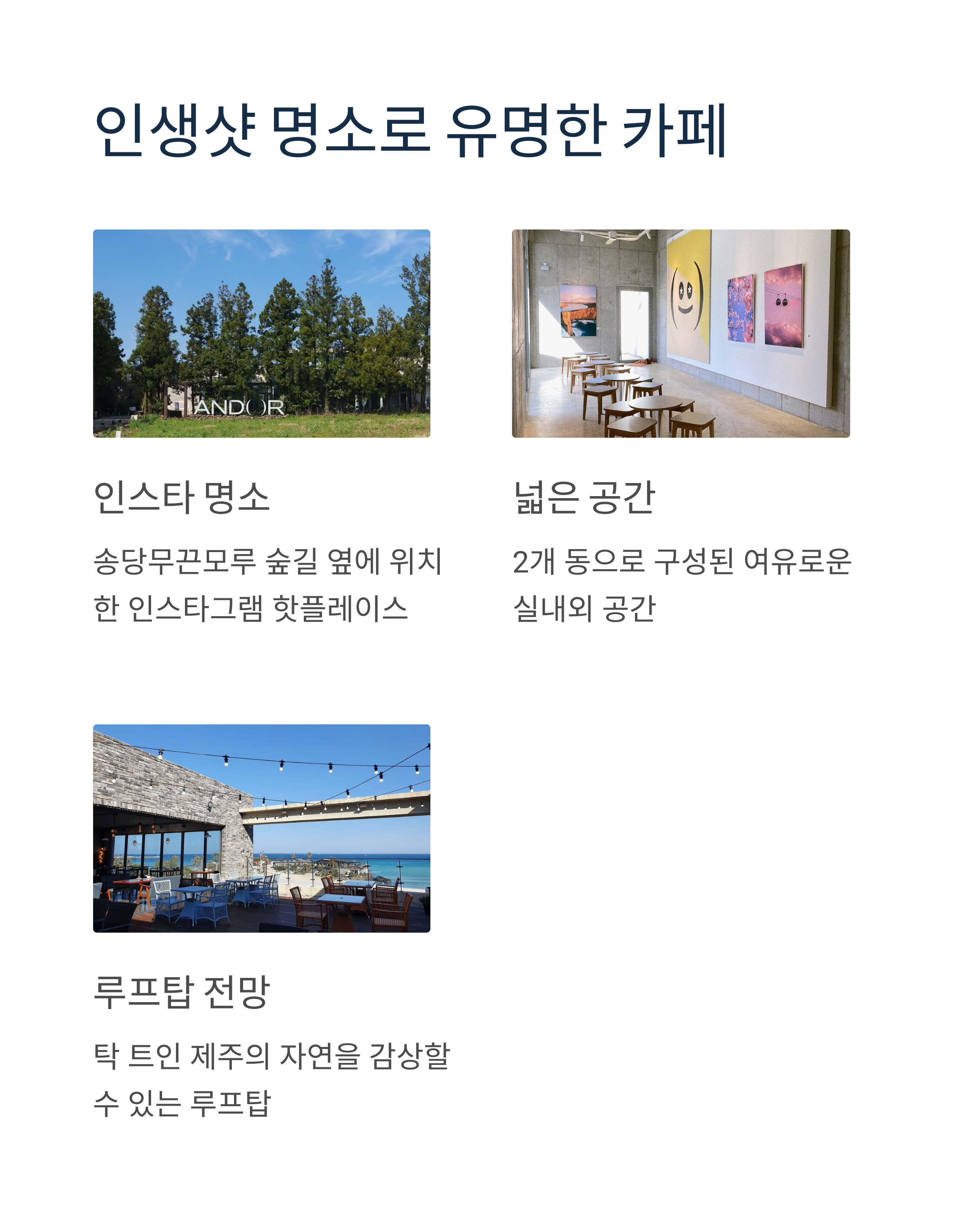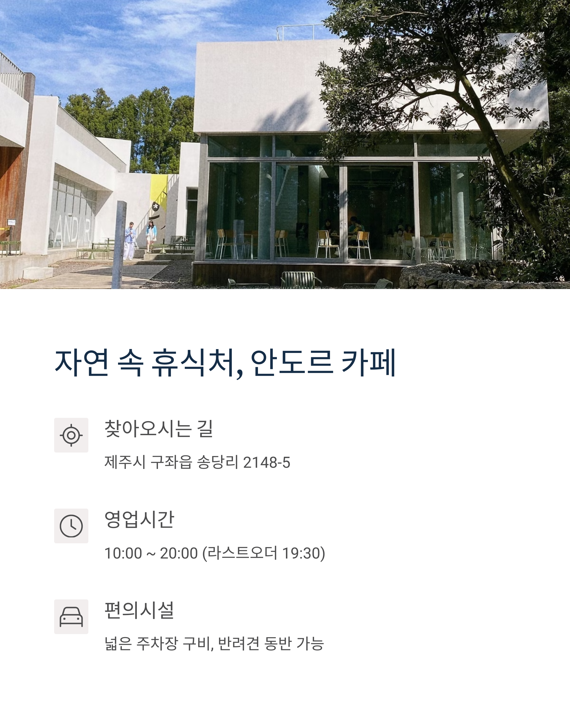 비자림 산책을 마친 후에는 인근 송당리에 위치한 안도르 카페에서 하루를 마무리해보세요. 감성적인 인테리어와 넓은 루프탑 공간이 인상적인 이곳은 자연 속에 녹아든 분위기를 자랑합니다. 시그니처 메뉴인 돌땅크라떼안돌오름 디저트는 카페만의 개성이 담겨 있어 꼭 맛보시길 추천드립니다. 반려견 동반이 가능한 친환경 공간이기도 하여 반려동물과 함께하는 여행객들에게도 인기가 많습니다. 또한 카페 주변은 송당무끈모루 등의 포토스팟도 있어 아름다운 여행 사진을 남기기 좋습니다.