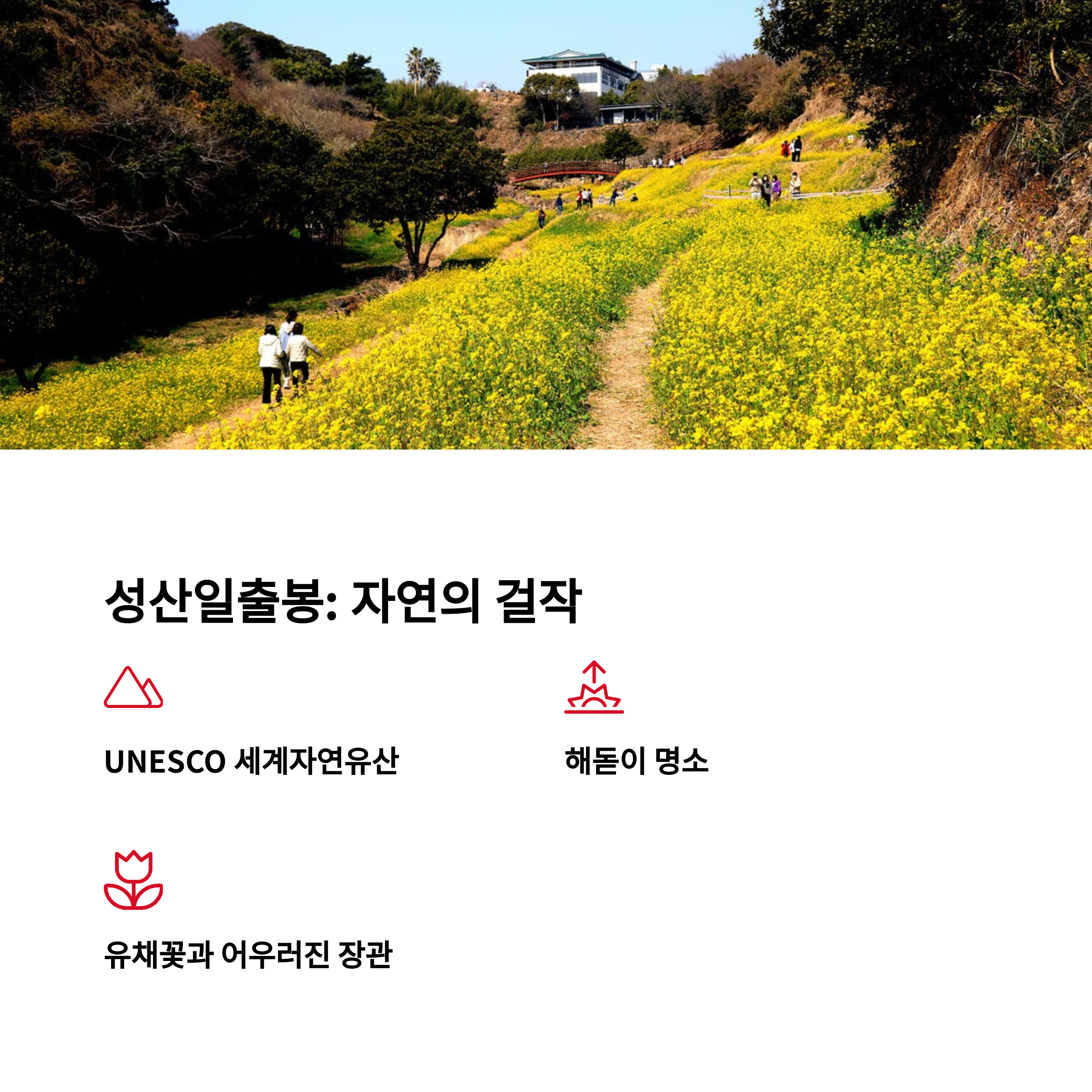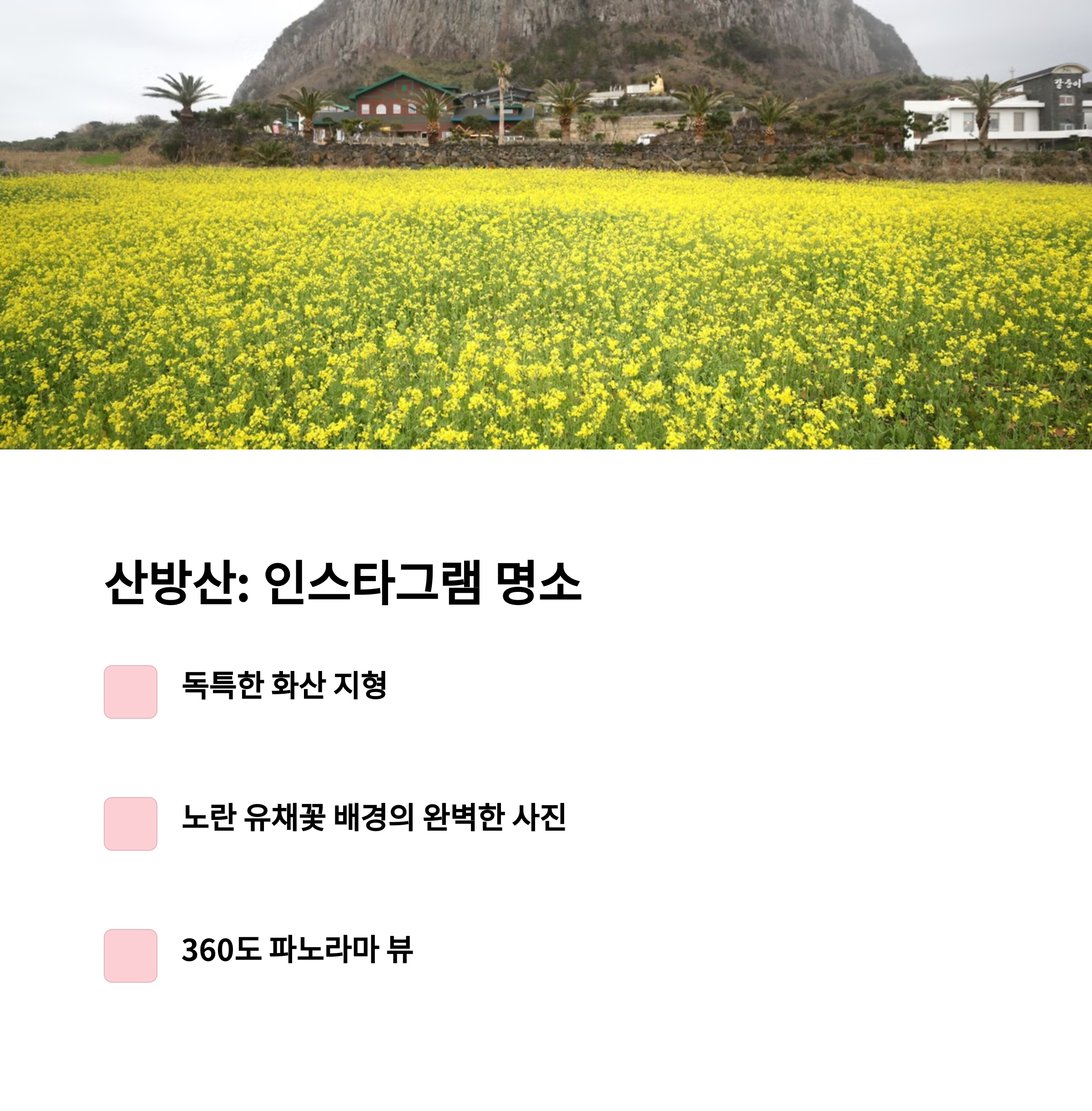 | 가족 사진 명소: 산방산, 성산일출봉 | 아이와 함께하는 자연 속 체험 | 숲길, 해변에서의 여유로운 힐링 가능 |