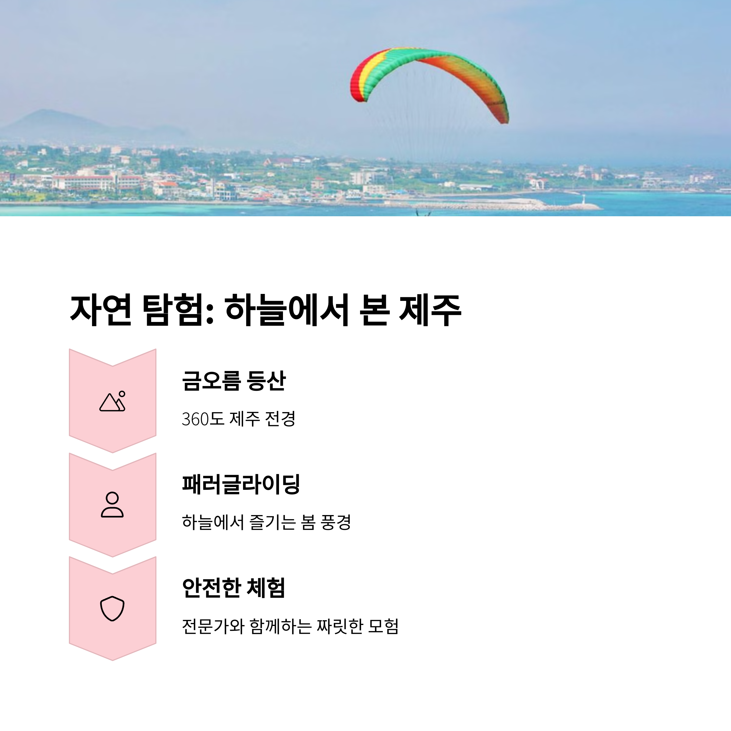 | 3~5월 제주 날씨는 온화하고 꽃이 많습니다. | 해변 활동과 패러글라이딩, 자연 체험 가능 | 무르체왓, 금오름, 함덕해변 추천 |