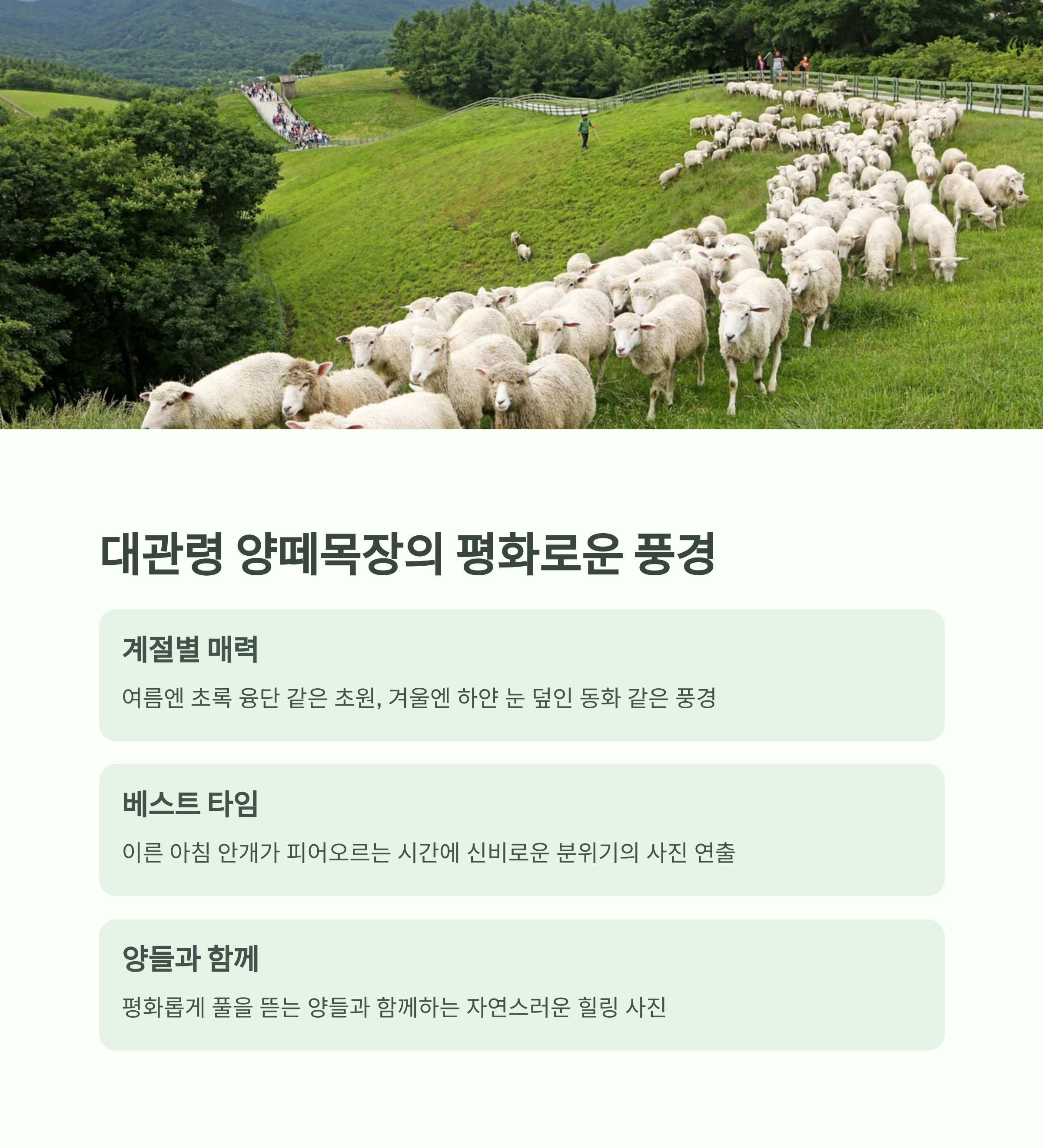 두 번째는 강원도의 대관령 양떼목장입니다. 푸른 초원과 자유롭게 풀을 뜯는 양들의 풍경은 마음까지 평화로워지는 장면을 연출합니다. 특히 봄과 여름에는 초록색 배경이 눈부시게 펼쳐지고, 겨울에는 새하얀 눈이 덮인 설원이 인생샷의 배경이 됩니다. 입장료도 부담 없고 산책로도 잘 정비되어 있어 가족 단위 여행객에게도 좋은 선택이 됩니다. 양들과 함께 찍는 사진은 동물과 자연의 조화로움을 보여주는 따뜻한 이미지를 선사합니다.