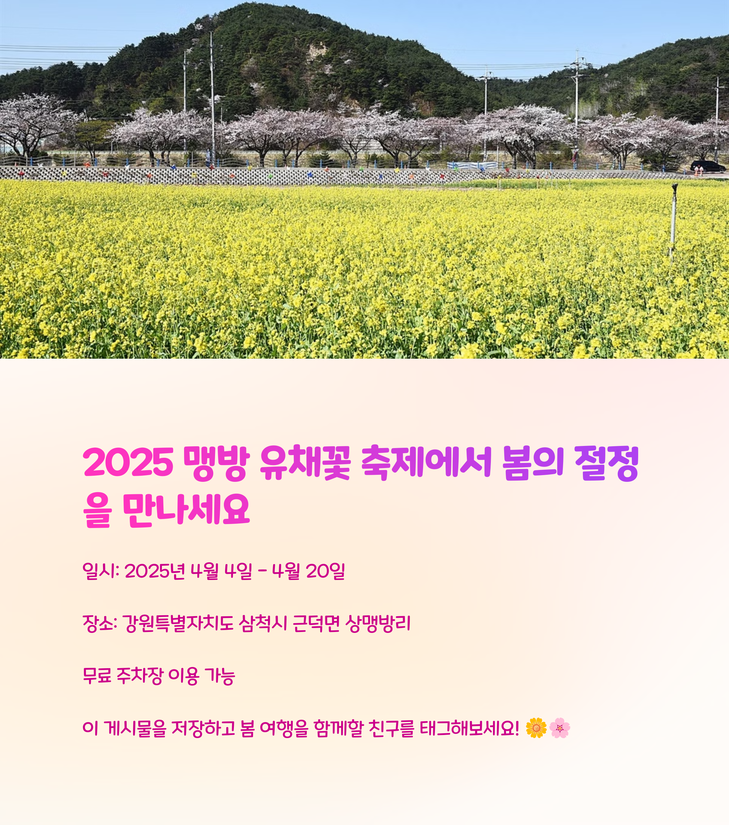 삼척 맹방유채꽃마을은 유채꽃과 벚꽃을 동시에 즐길 수 있는 특별한 봄 여행지입니다. 다양한 축제 프로그램과 체험 활동을 통해 봄의 정취를 만끽할 수 있으며, 바다와 꽃밭이 어우러진 풍경은 한 번 가면 잊을 수 없는 추억을 만들어 줍니다. 이번 봄, 가족이나 친구, 연인과 함께 삼척 맹방유채꽃마을을 방문해보세요.