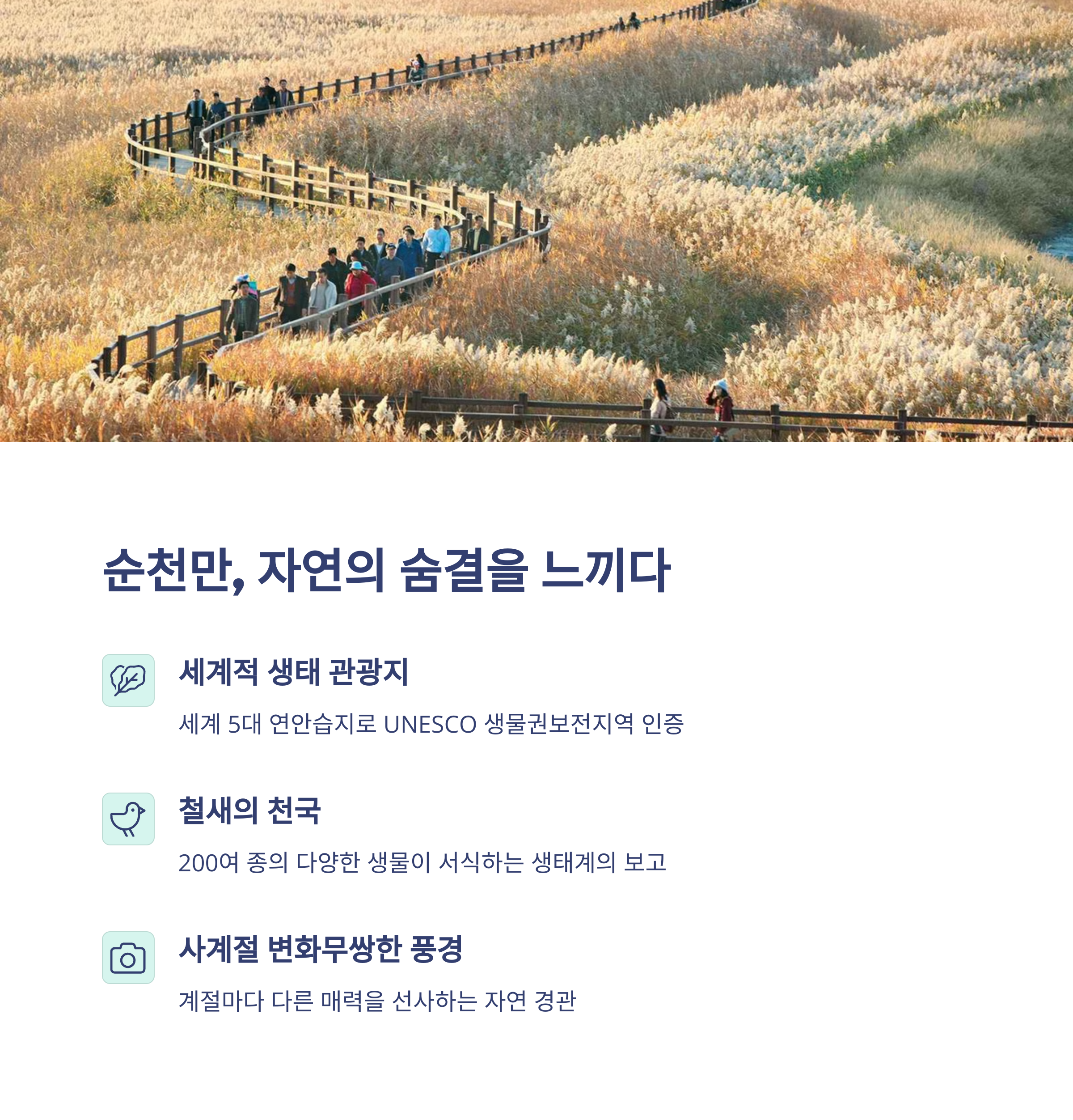 순천만국가정원과 순천만습지는 생태 보전과 관광의 조화를 이룬 대표적인 복합 관광지입니다. 광활한 정원 공간에는 세계 각국의 테마 정원과 계절마다 달라지는 꽃들이 조성되어 있어 사계절 내내 즐길 수 있는 자연 명소로 사랑받고 있습니다. 인근 순천만습지에서는 갈대밭과 갯벌을 따라 철새를 관찰할 수 있는 탐방로가 마련되어 있어 생태 체험과 사진 여행으로도 매력적입니다.