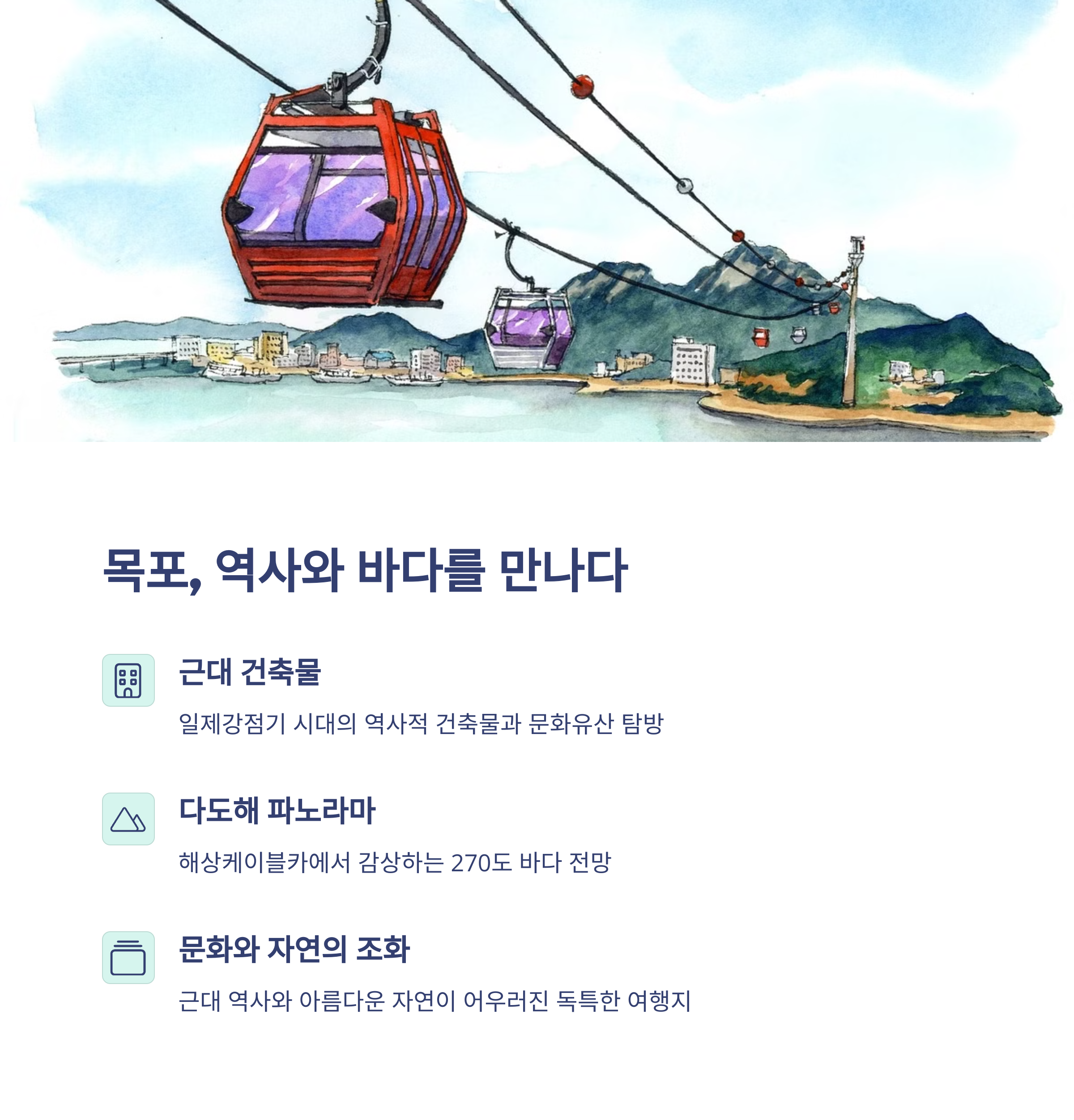 산청 동의보감촌은 한방 치유와 약초 체험을 직접 경험할 수 있는 건강 테마 복합 단지입니다. 한의학박물관, 건강길, 족욕 체험장 등이 마련되어 있어 자연 속에서 휴식을 취하며 건강도 챙길 수 있습니다. 목포근대역사공간은 100년 넘은 근대 건축물들이 보존된 거리로, 문화재 관람과 함께 해상케이블카를 통해 다도해 풍경까지 즐길 수 있는 복합 여행지로 각광받고 있습니다.