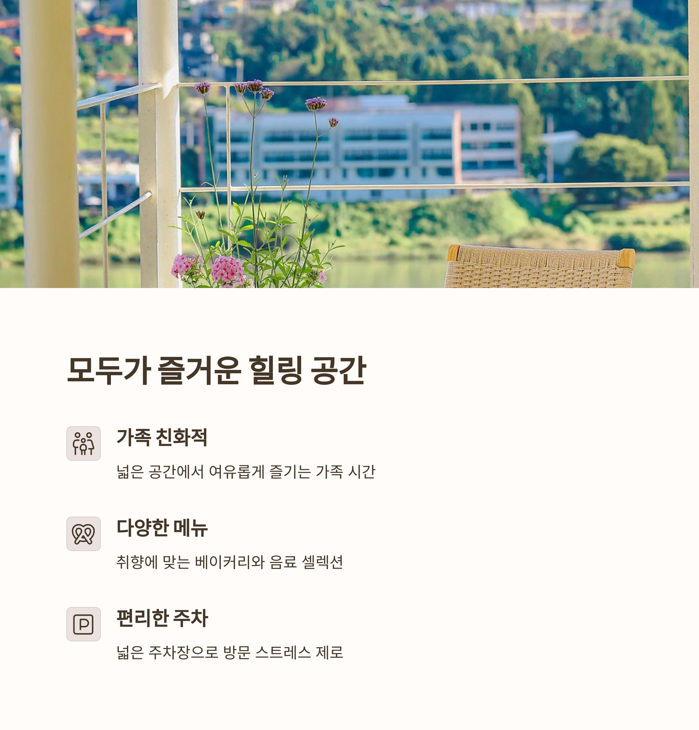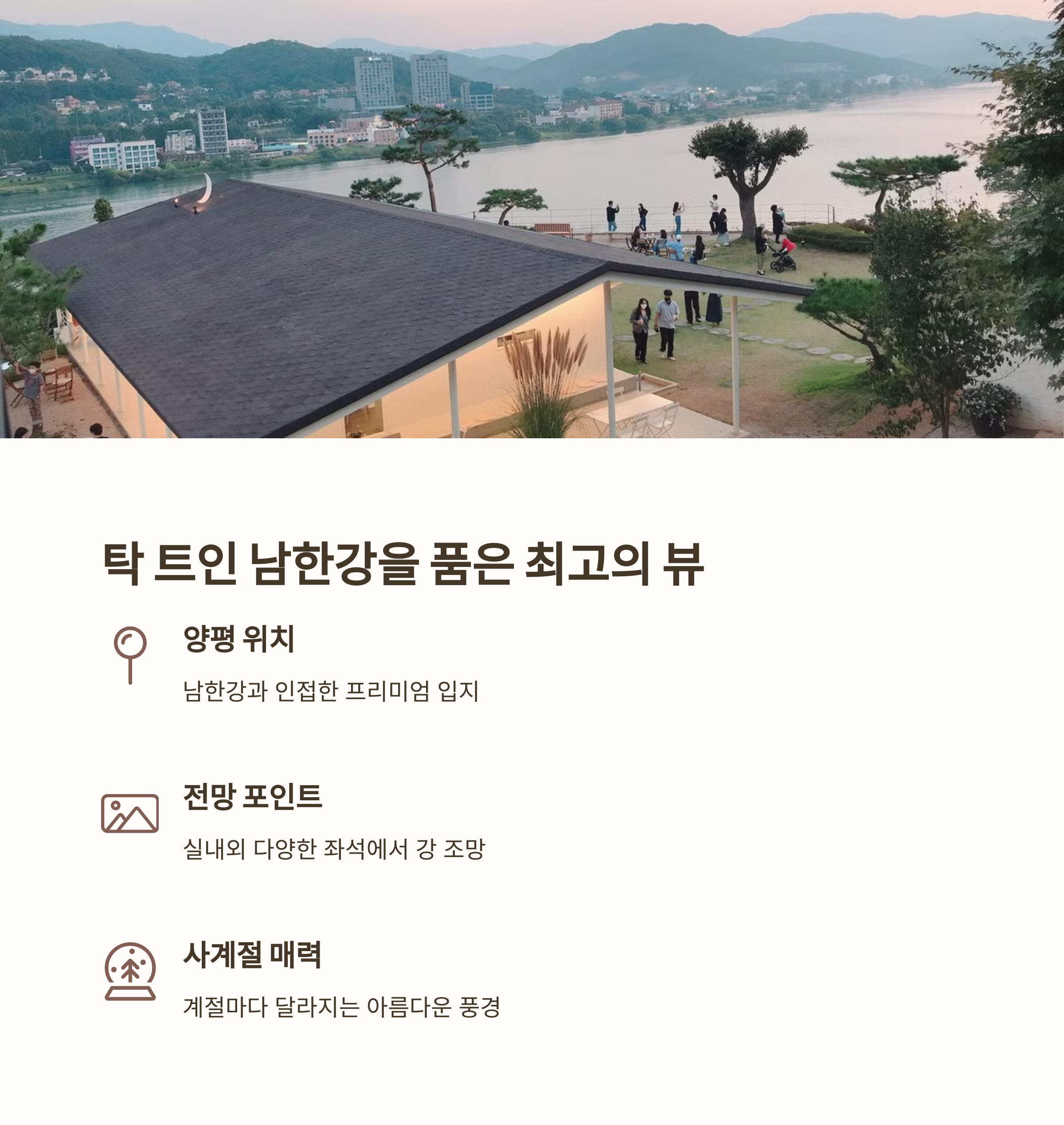 | 남한강 뷰, 정원, 테라스 있는 감성 카페 | 직접 로스팅, 부드러운 아메리카노 | 바삭함과 촉촉함, 감성 디저트 |