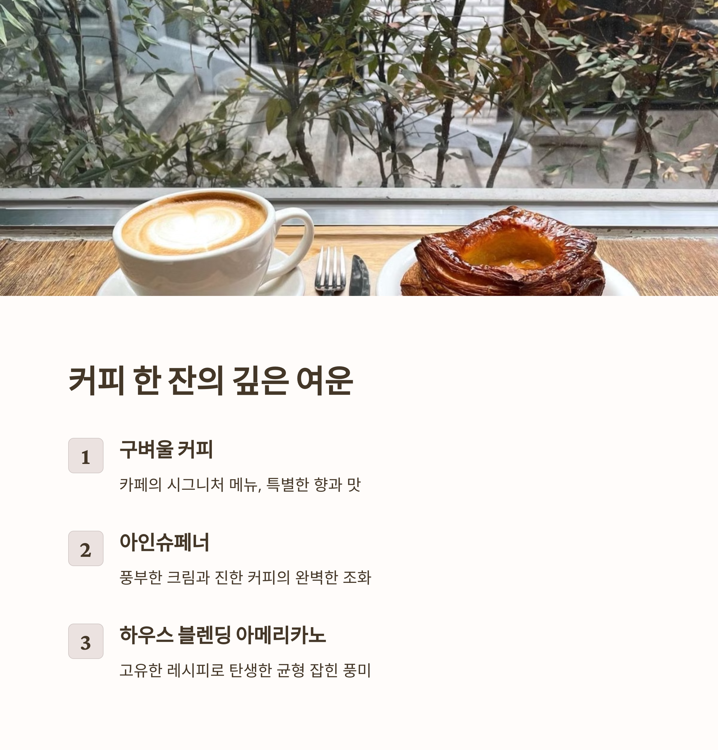 | 대표 메뉴 | 구벼울 커피, 아인슈페너, 쌀 소금빵이 인기예요. |