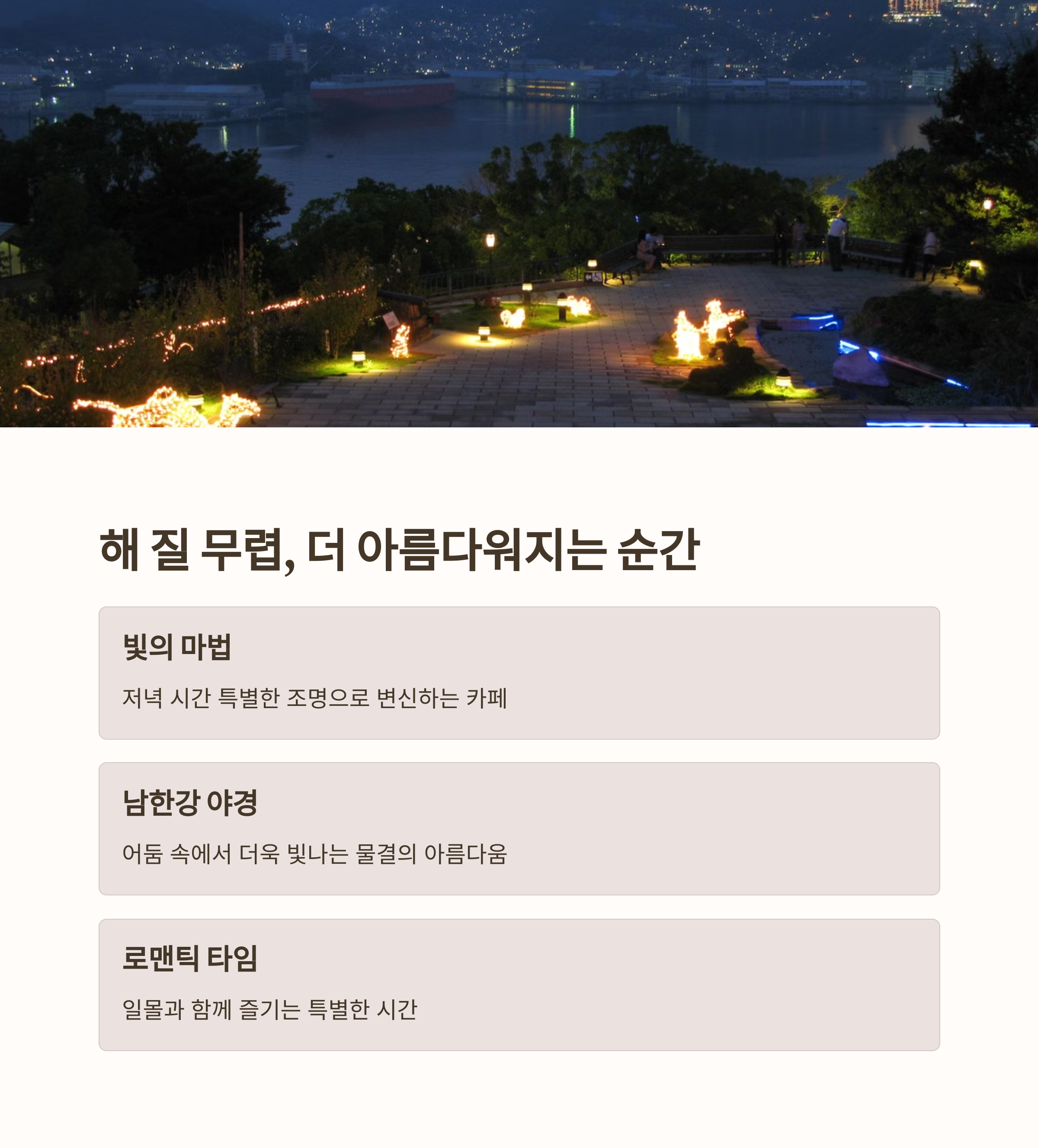 구벼울은 연예인 남상미씨가 직접 운영하는 카페로도 잘 알려져 있으며, 방문객 중에는 팬들도 많습니다. 특히 가족 단위의 방문객에게도 적합한 공간으로, 주차 공간이 넉넉하고 아이들과 함께 즐기기에 편리한 구조로 되어 있습니다. 저녁이 되면 카페 외부에 조명이 들어오면서 남한강의 야경이 더욱 감성적으로 다가옵니다. 낮과 밤, 모두 다른 분위기를 경험할 수 있어 재방문 의사가 생기는 공간입니다.