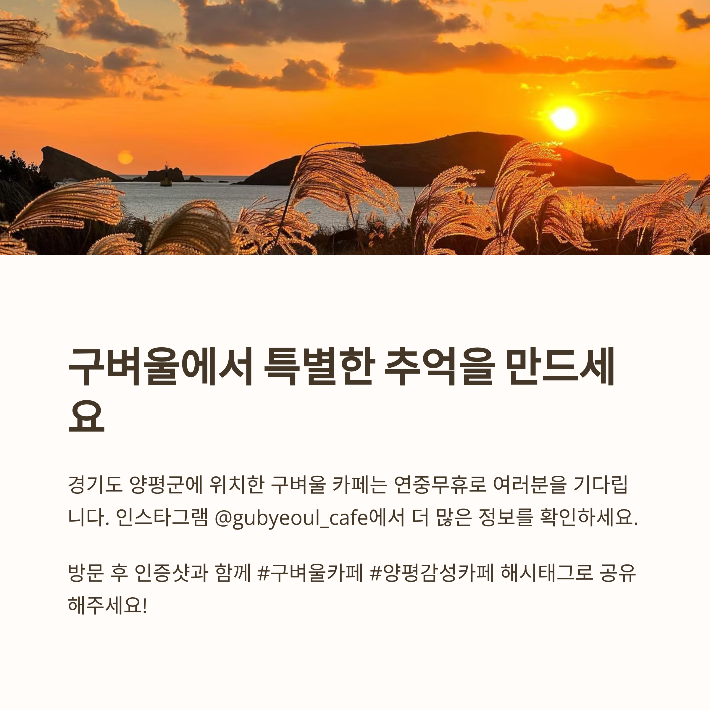 여러분은 어떤 감성 카페를 좋아하시나요? 구벼울처럼 자연과 함께할 수 있는 장소가 있다면 댓글로 공유해 주세요. 서로의 여행지를 추천하며 감성을 나누는 공간이 되었으면 좋겠습니다!