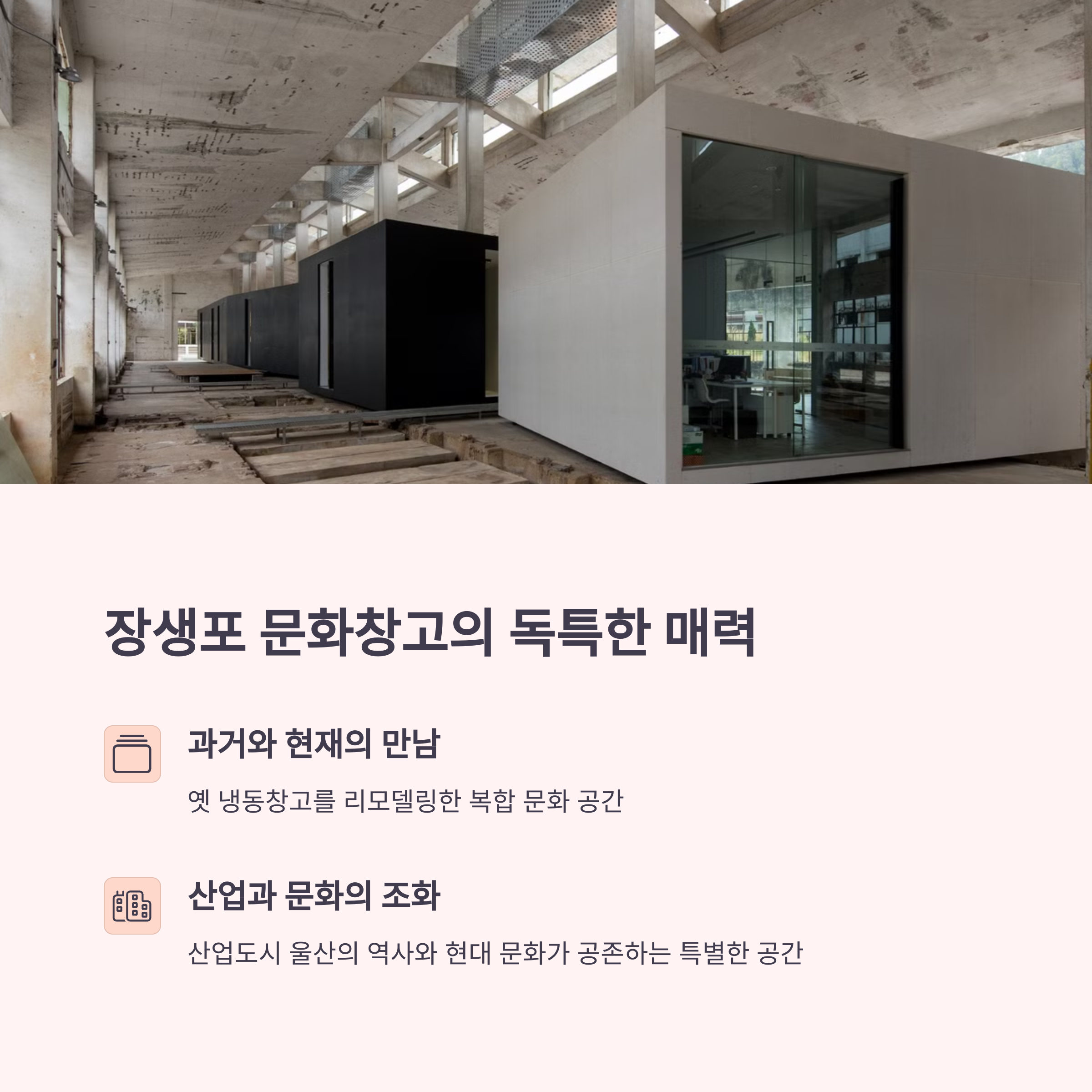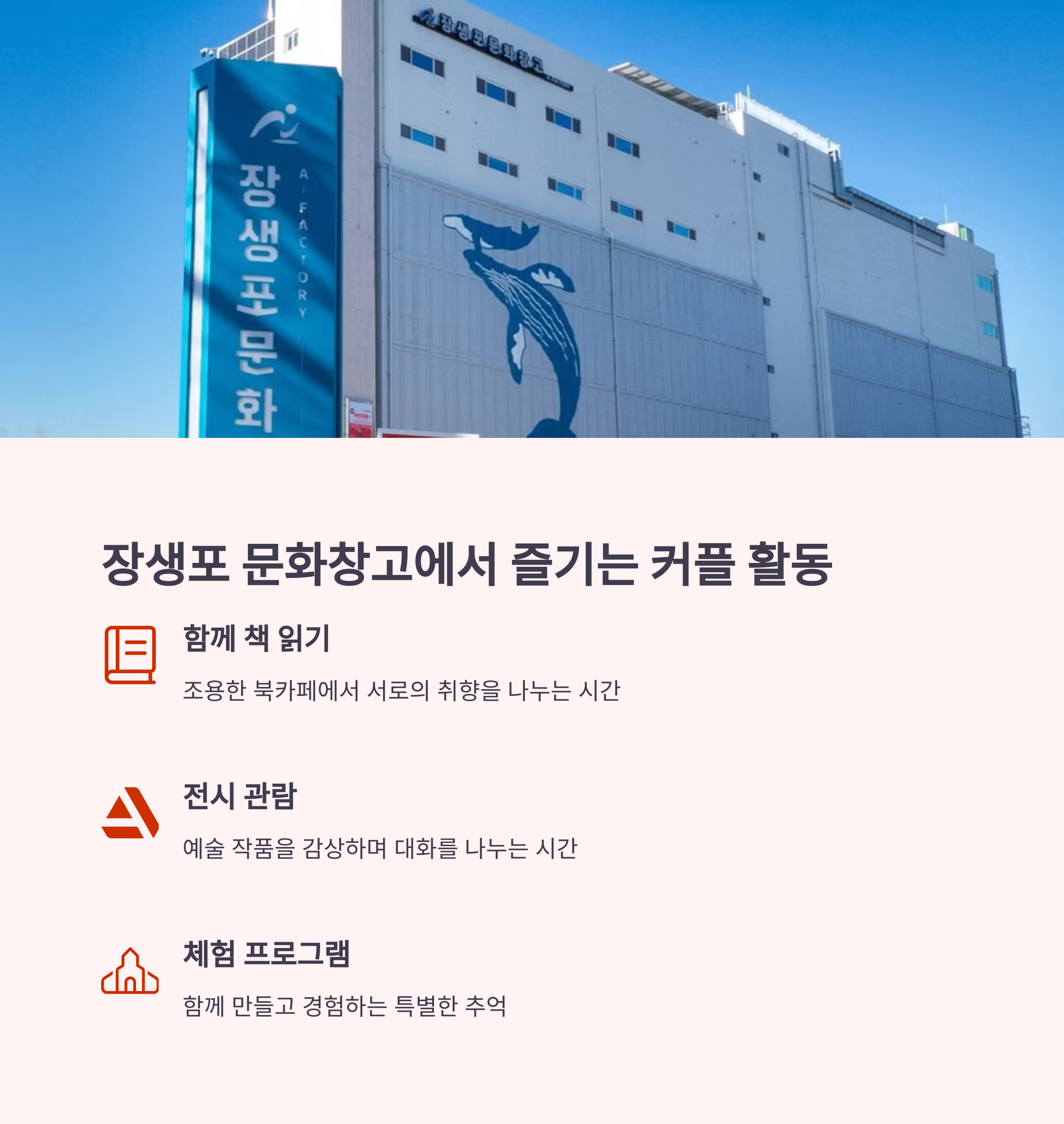 바쁜 일상 속에서 특별한 시간을 찾고 싶을 때, 울산 장생포 문화창고는 쉼과 예술, 감성을 모두 갖춘 공간으로 제격입니다. 북카페에서 나누는 대화, 바다를 바라보며 함께하는 커피 한 잔, 전시를 감상하며 나누는 생각들. 모든 순간이 추억이 되는 커플 여행지입니다. 이번 주말, 특별한 하루를 만들고 싶다면 장생포로 떠나보세요.
