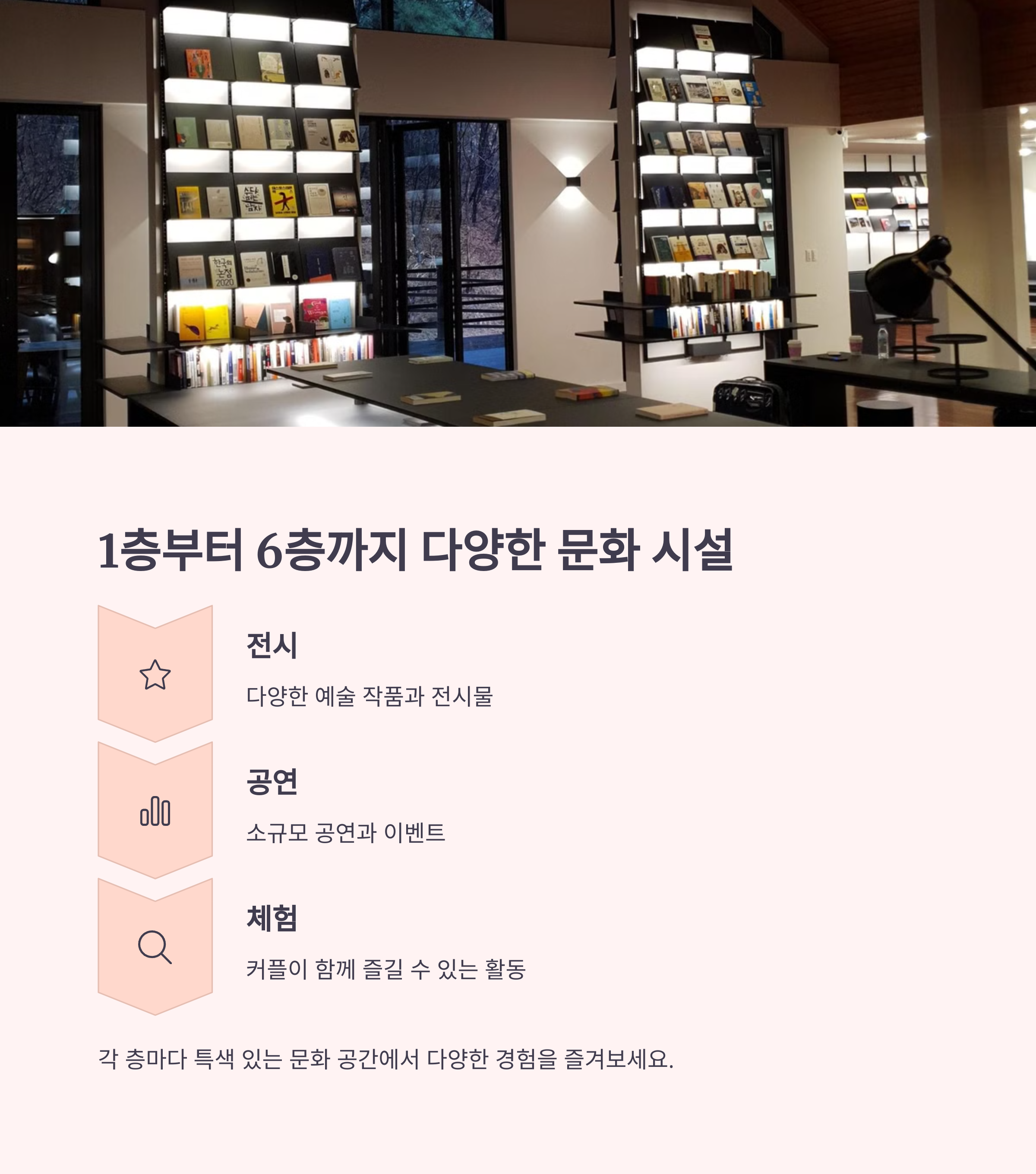 | 감성 가득한 책과 바다를 동시에 즐기는 여행지 | 6층 전망 좋은 북카페에서 여유로운 시간 | 전시, 체험, 예술을 한 번에 즐길 수 있는 공간 |