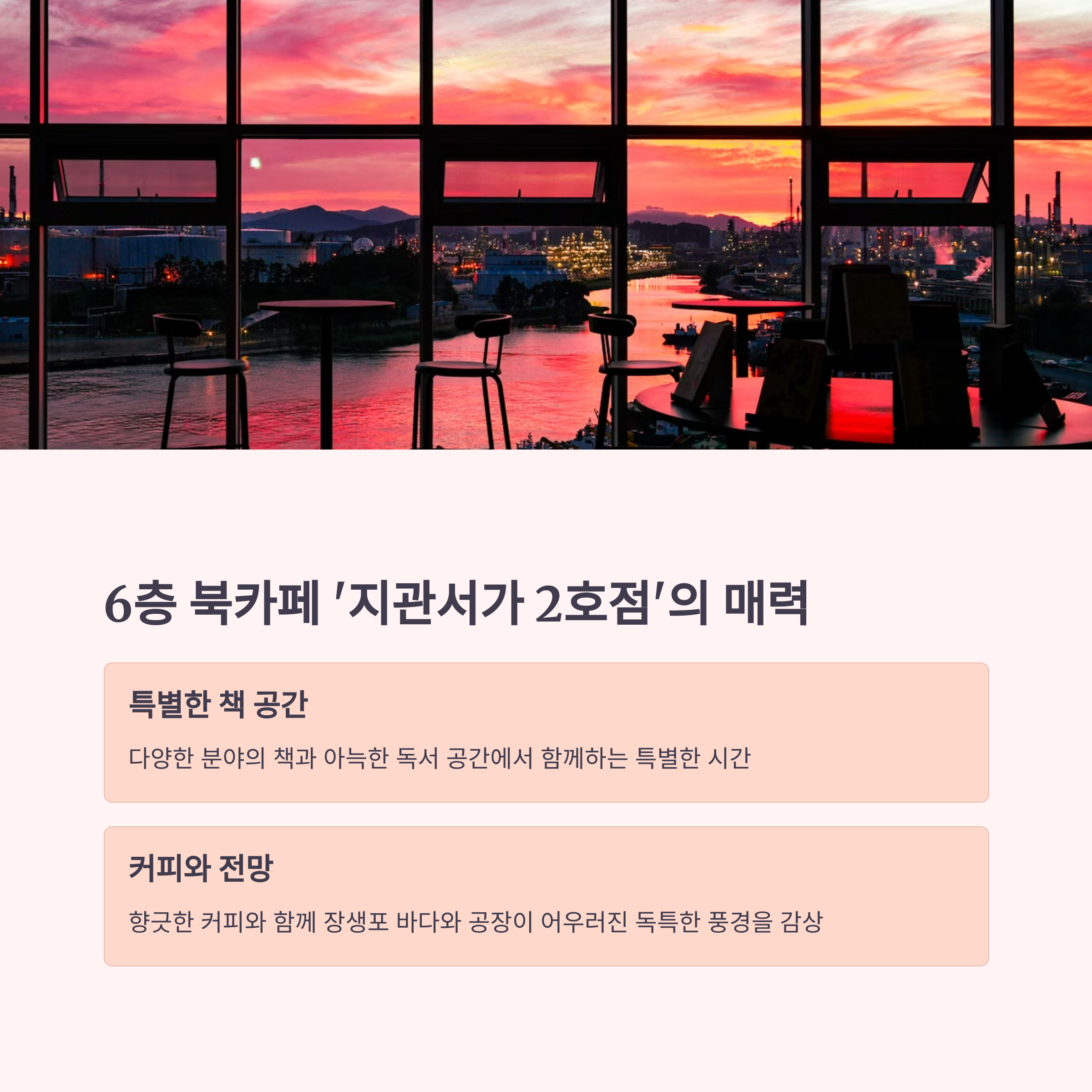 6층에 위치한 지관서가 2호점 북카페는 커플 여행자들이 가장 많이 찾는 공간입니다. 다양한 분야의 책들이 구비되어 있어 독서를 즐기며 대화를 나누기에 안성맞춤이고, 통유리창 너머로 보이는 장생포 바다와 산업단지의 풍경은 마치 액자 속 그림처럼 인상적입니다. 조용한 분위기 덕분에 서로에게 집중할 수 있는 아늑한 시간이 됩니다.