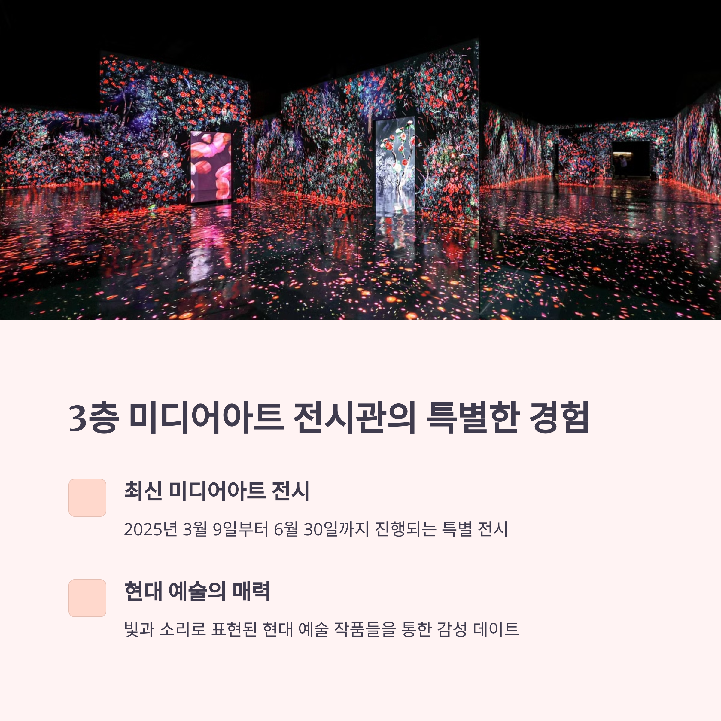 3층의 미디어아트 전시관에서는 최신 기술을 활용한 예술 전시가 진행 중입니다. 2025년 3월부터 6월 말까지는 디지털 예술과 감각적 미디어를 체험할 수 있는 특별 전시가 열리고 있어 더욱 풍성한 문화 경험이 가능합니다. 운영 시간은 오전 10시부터 오후 9시까지이며, 누구나 부담 없이 방문할 수 있어 데이트 장소로 이상적인 선택입니다.