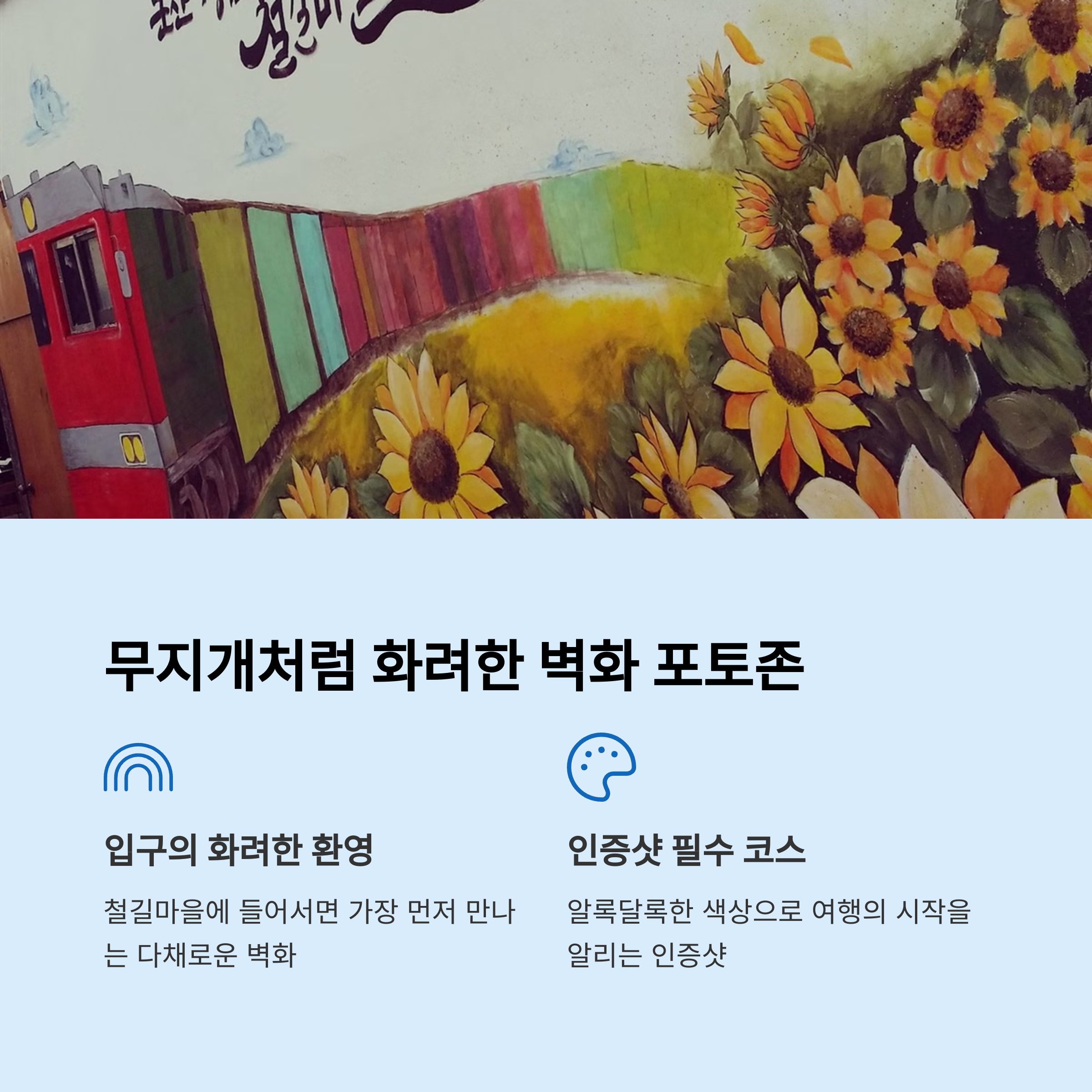 철길마을의 대표 포토존 중 하나는 바로 노란집입니다. 눈에 확 띄는 노란색 외관과 철로 위에 놓인 기차 모형이 함께 어우러져, 레트로한 감성의 인생샷을 남기기에 완벽한 장소죠. 입구 쪽에 자리한 무지개 벽화 포토존 역시 빼놓을 수 없습니다. 다채로운 색감의 벽화를 배경으로 사진을 찍으면, 누구나 감성 가득한 여행 인증샷을 남길 수 있습니다.