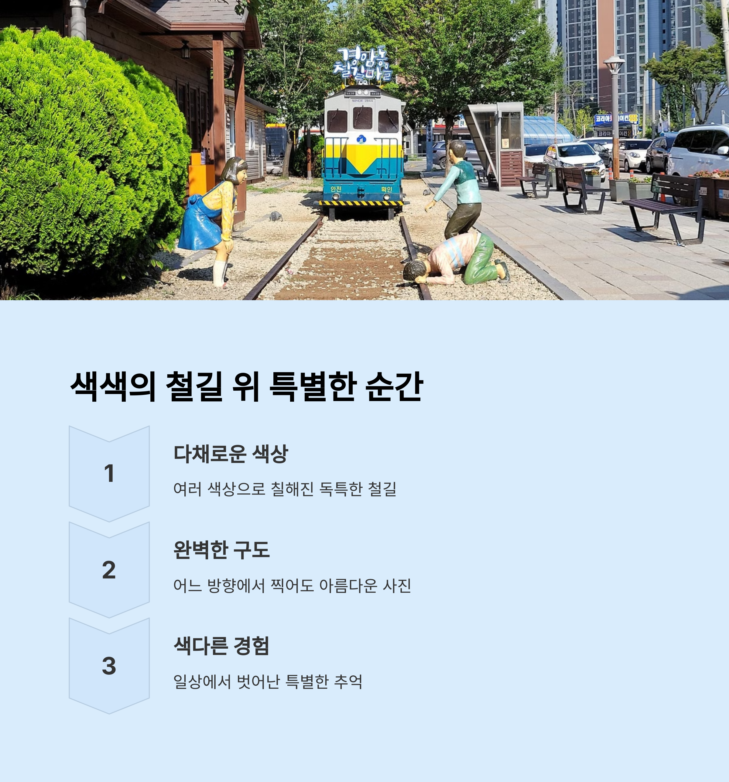 군산 경암동 철길마을은 과거 기차가 다니던 좁은 골목길을 중심으로 형성된 마을로, 지금은 레트로 감성 가득한 관광지로 재탄생했습니다. 철길 위를 걷는 색다른 경험과 함께 마을 곳곳에는 포토존이 마련되어 있어 사진 찍기 좋은 장소로 SNS에서 입소문을 타고 있습니다. 골목마다 복고풍 소품과 벽화, 기차 모형 등이 있어 걷기만 해도 자연스럽게 감성 사진이 완성되는 곳입니다.
